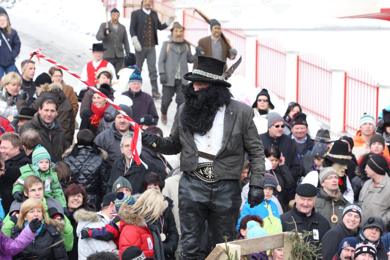 Der Miassmann und der Bär tragen mit vereinten Kräften sehr viel dazu bei, dass der Bloch am Ende des Umzugs an seinem Bestimmungsort, beim sogenannten „Fonnes“, im Dorfzentrum landet.