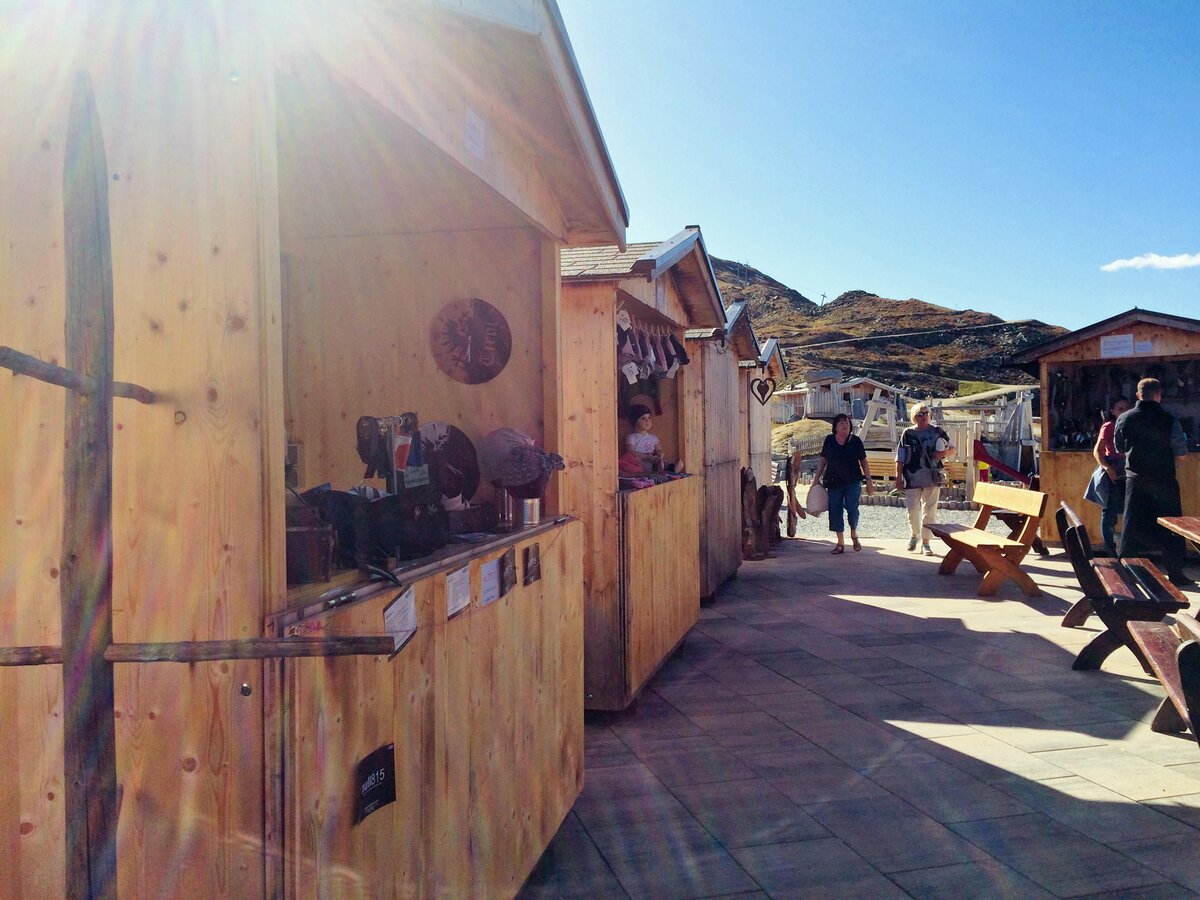 Zahlreiche Hütten vor dem Bergrestaurant bieten allerlei Kunsthandwerk an. Sie laden zum Bummeln inmitten der traumhaften Bergkulisse ein. Souvenirjäger, die auf der Suche nach dem besonderen Geschenk sind, sind hier genau richtig!