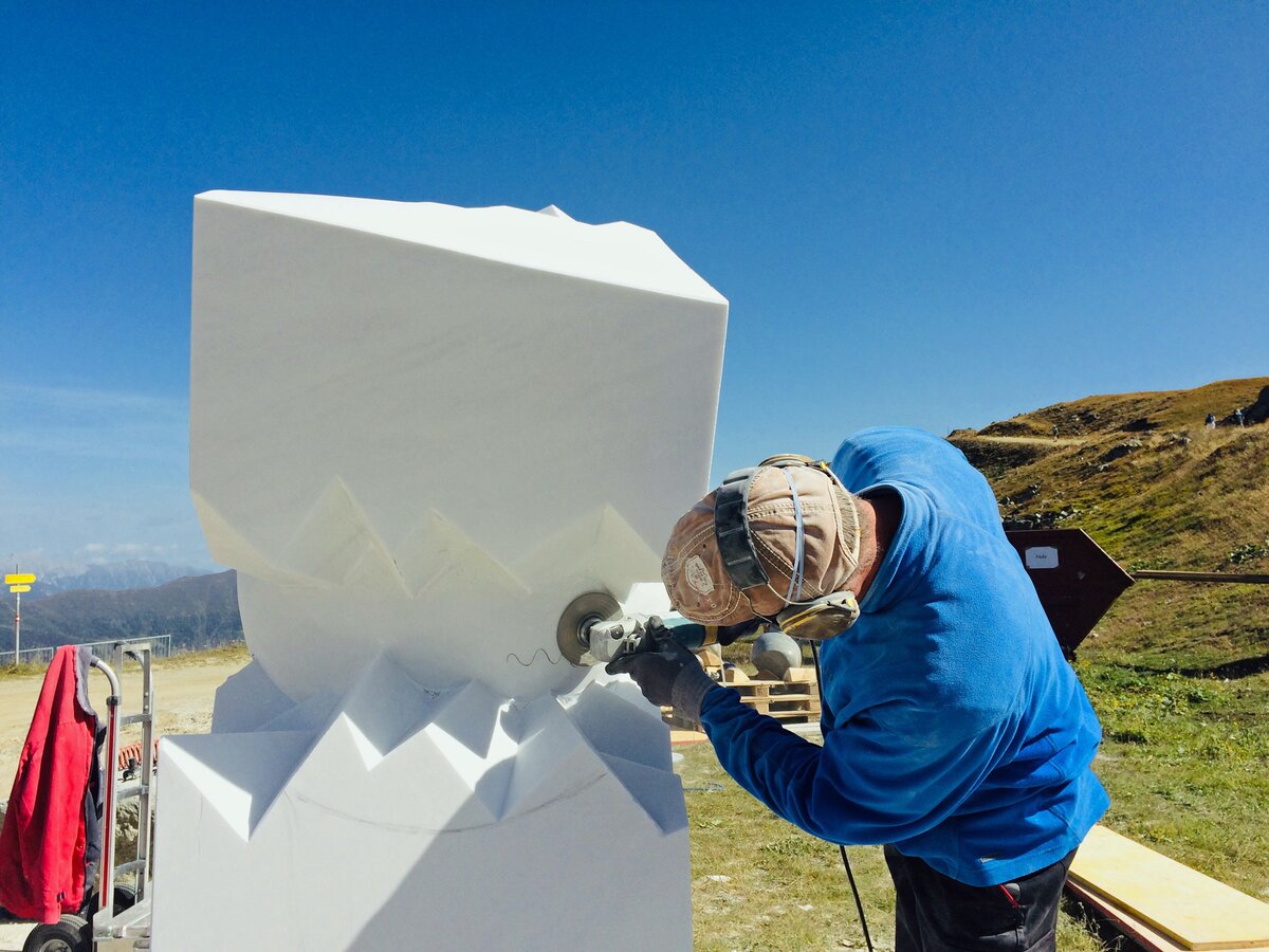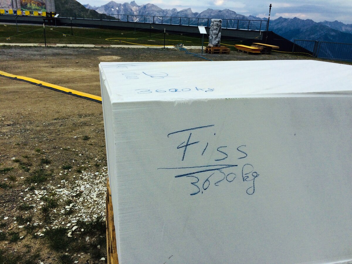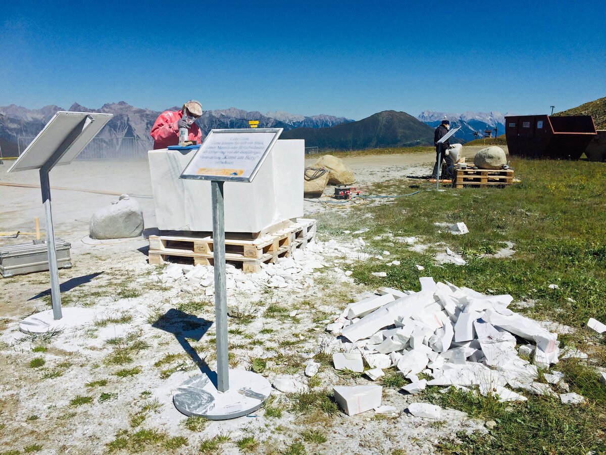 Die Besucher hatten die Möglichkeit, sich ein Stück „Abfall“ direkt neben den Kunstwerken mitzunehmen. Ein duftendes Stück Zirbenholz oder lieber ein leuchtender Marmorstein vom über drei Tonnen schweren Laaser Marmorblock, der für Thomas Lüscher aus dem Südtirol nach Fiss gehievt wurde. Die Erinnerung an dieses Kunstevent soll auch daheim noch währen. Ein tolle Idee, die bei meinen Besuchen am Schönjoch für strahlende Augen sorgte. Ein Besucher ließ sich sogar vom Künstler höchstpersönlich sein Andenken auf einer Seite abschneiden, damit er es in seiner Heimat hübsch aufstellen kann.