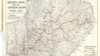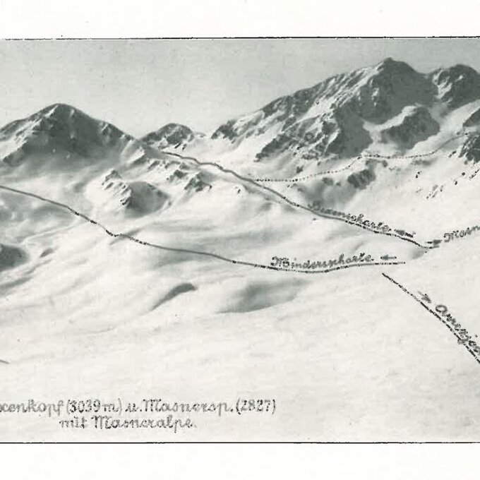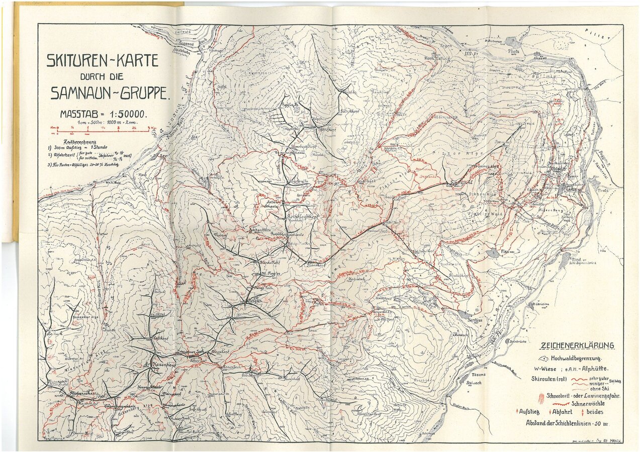 Vor mir liegt eine mehr als 100 Jahre alte SKITOURENKARTE im Maßstab 1:50.000. Sie gehört ebenfalls zum Büchlein. Könntest du mit der Karte etwas anfangen? Gar nicht so einfach, oder? Da sind die Pistenpläne von heute doch etwas gewohnter.