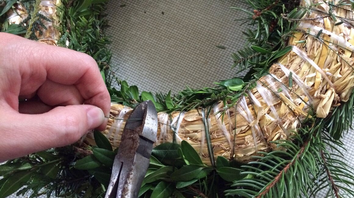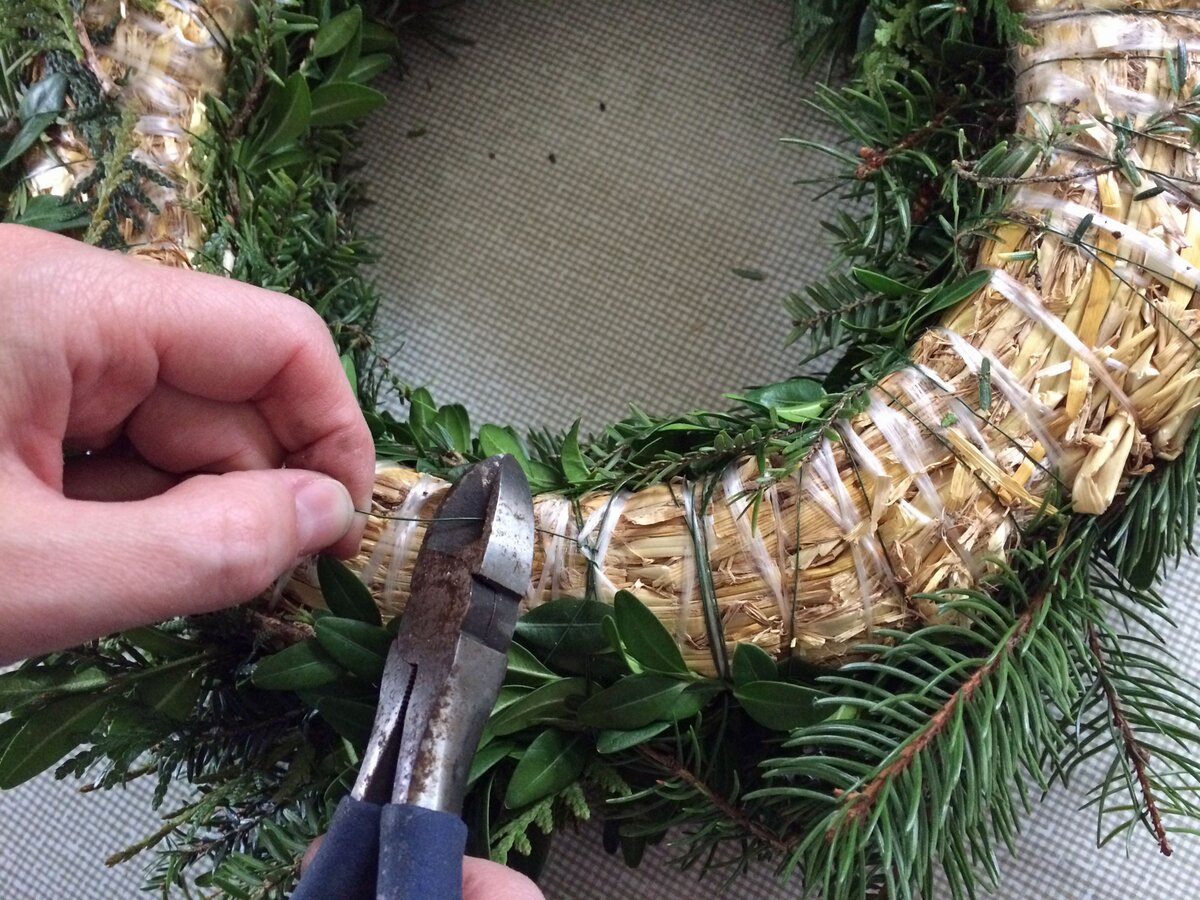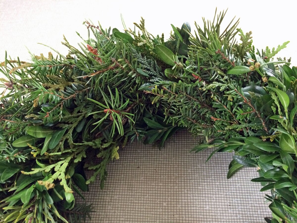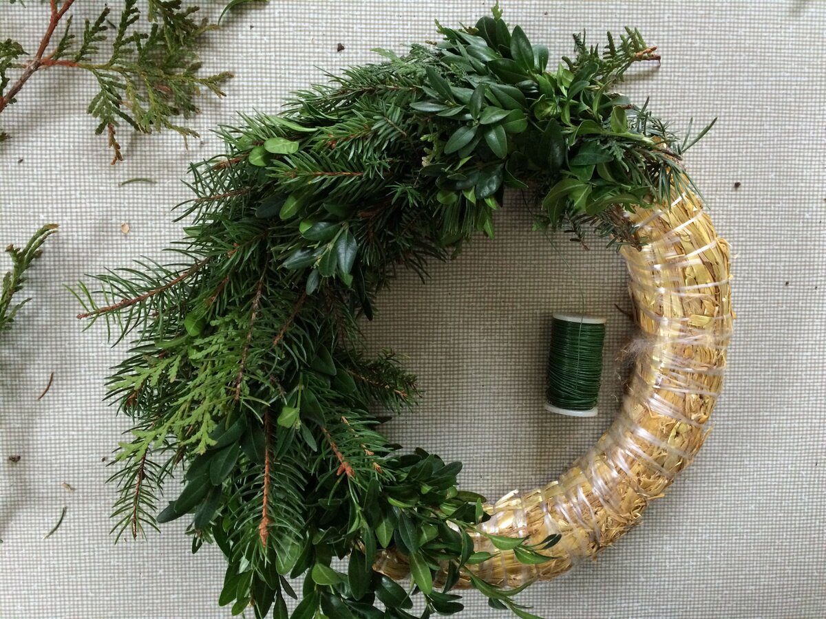 Hier sind der Kreativität keine Grenzen gesetzt. Gemischtes Grün macht sich gut. Gerne kann hier natürlich ganz klassisch mit Tannengrün gearbeitet werden. Ich bevorzuge aber das Spiel mit unterschiedlichen Strukturen und Farben. Neben den klassischen Tannenzweigen nahm ich Buchs-, Föhren und auch Thujenzweige. Die Länge der Zweige ist Geschmackssache. Je länger die Zweige sind, umso buschiger wird der Kranz.