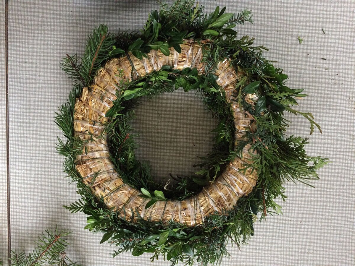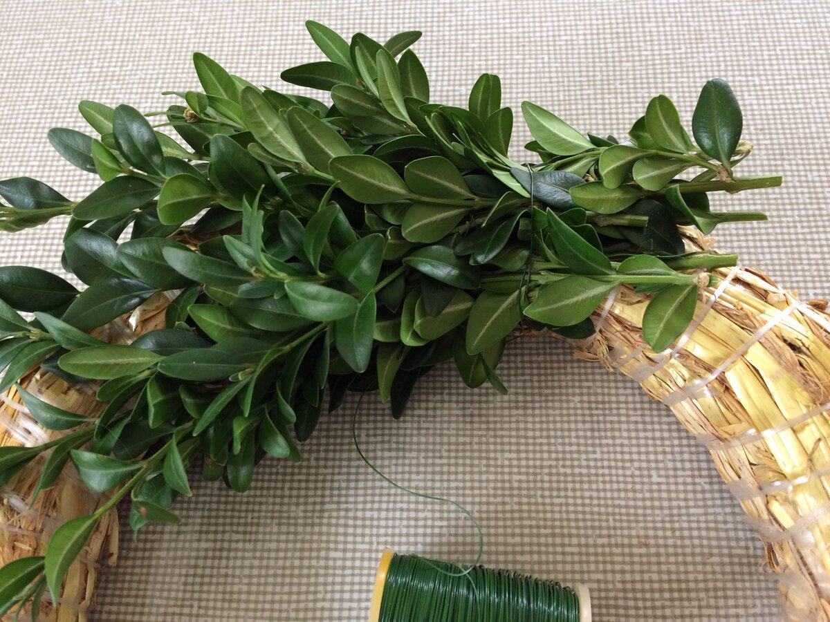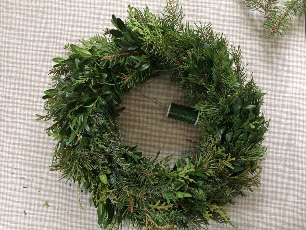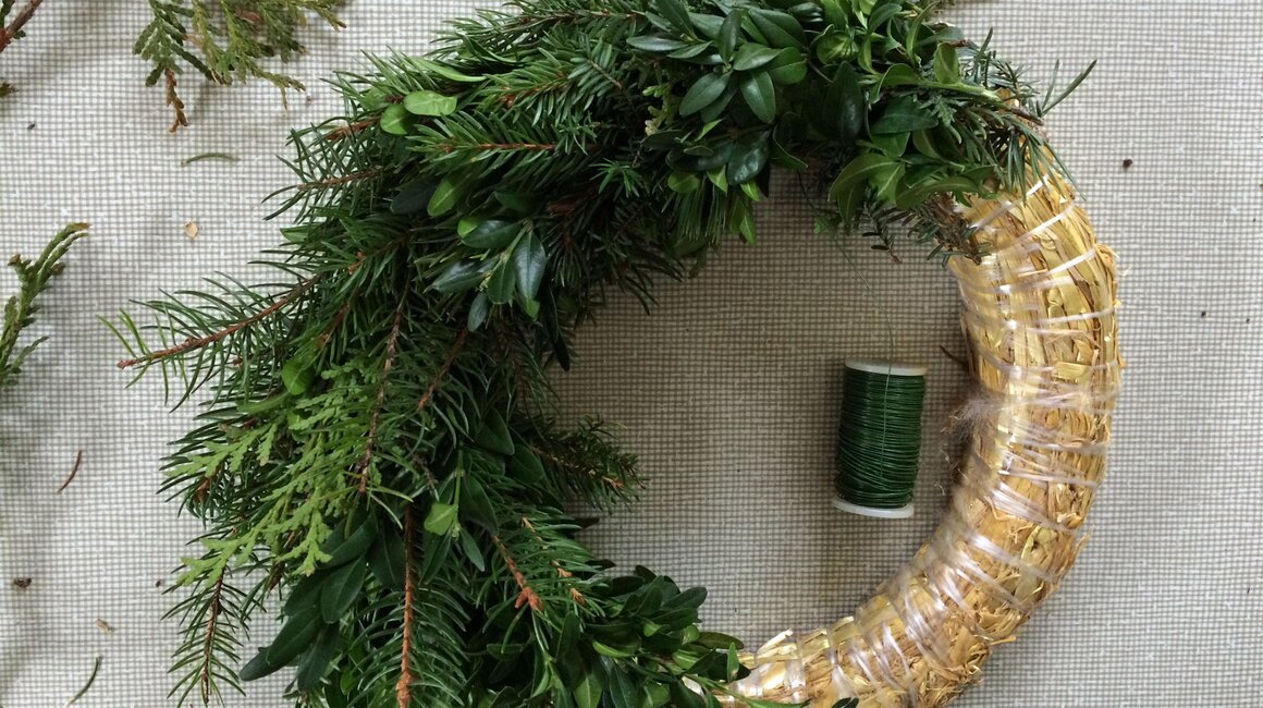 Hier sind der Kreativität keine Grenzen gesetzt. Gemischtes Grün macht sich gut. Gerne kann hier natürlich ganz klassisch mit Tannengrün gearbeitet werden. Ich bevorzuge aber das Spiel mit unterschiedlichen Strukturen und Farben. Neben den klassischen Tannenzweigen nahm ich Buchs-, Föhren und auch Thujenzweige. Die Länge der Zweige ist Geschmackssache. Je länger die Zweige sind, umso buschiger wird der Kranz.