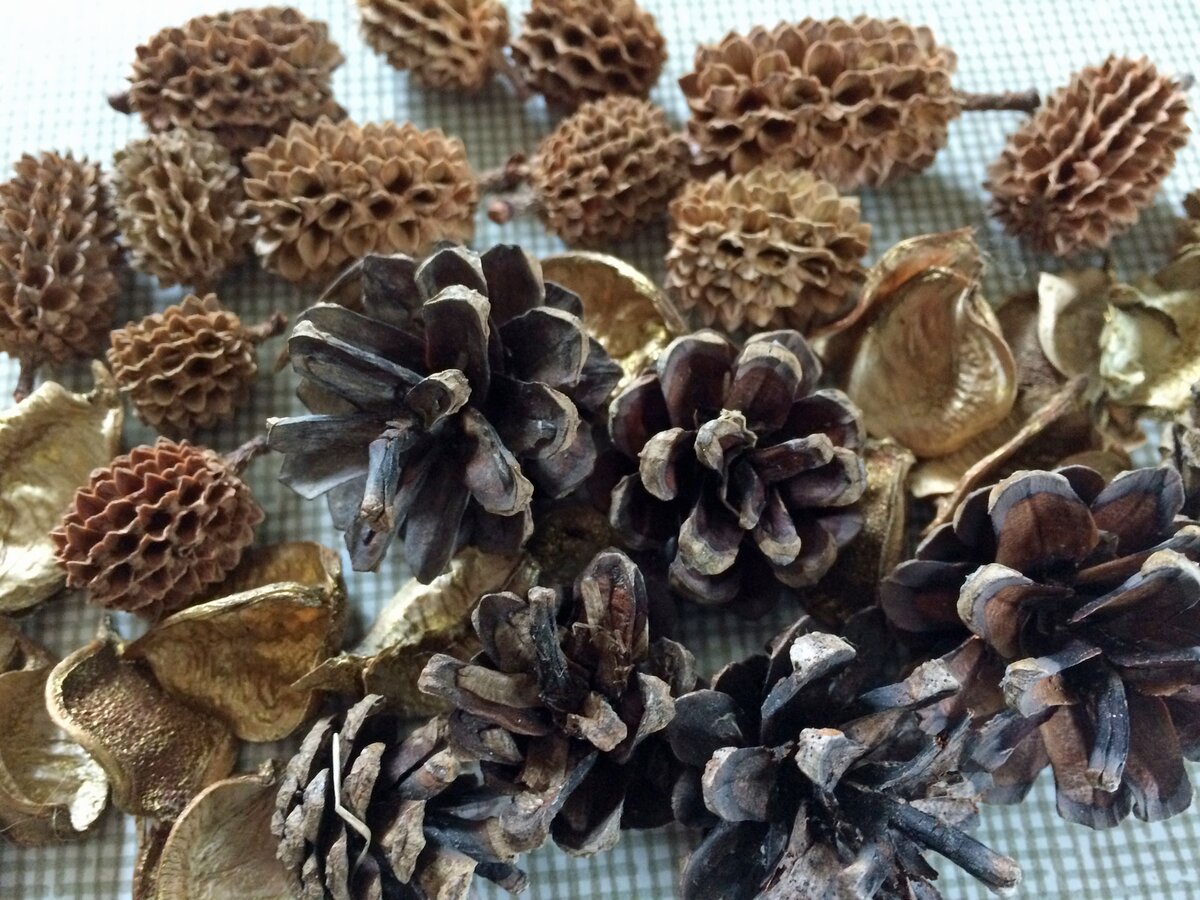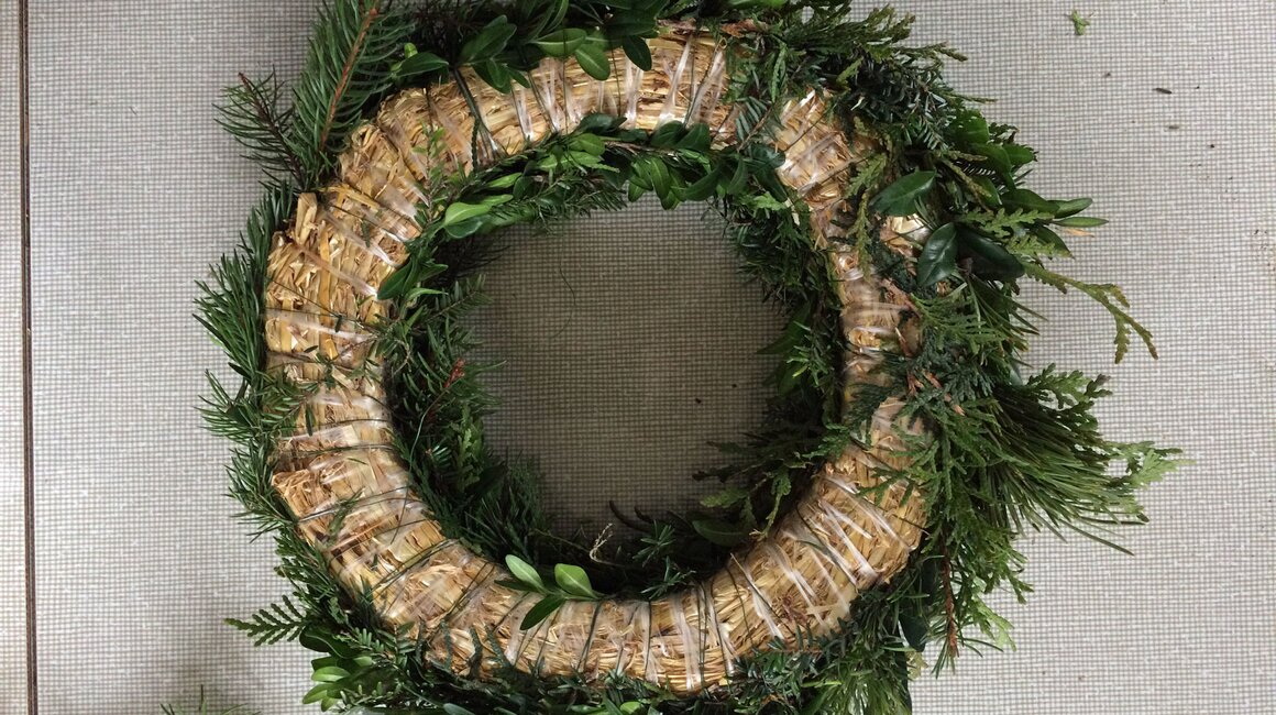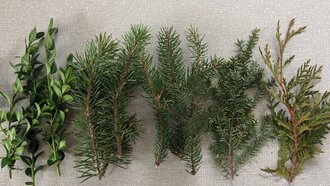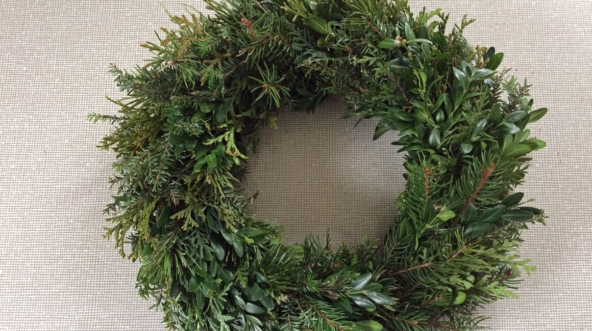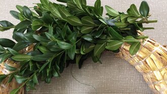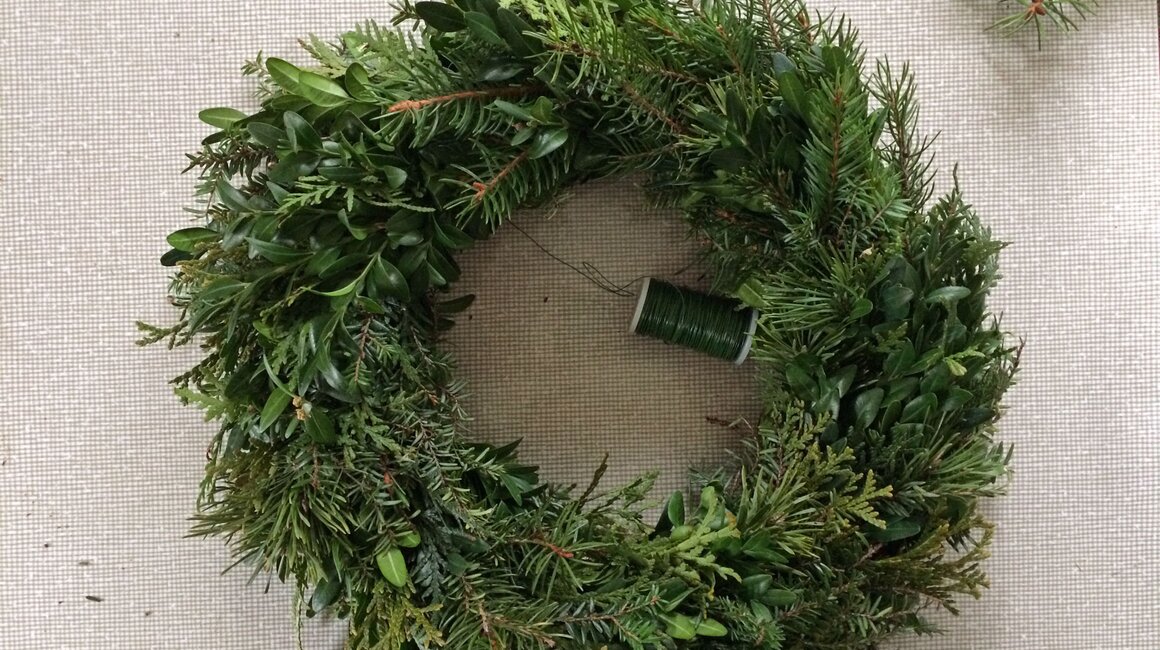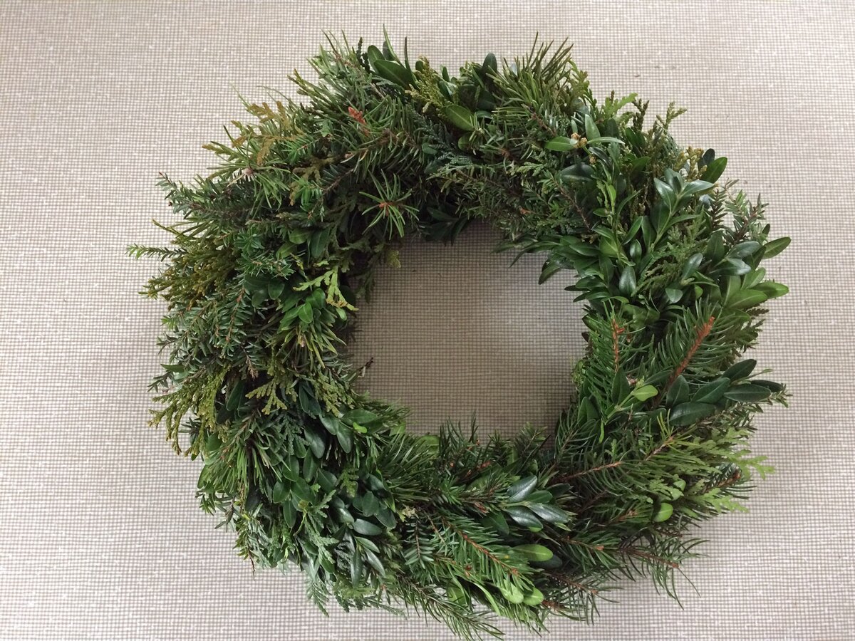Hier sind der Kreativität keine Grenzen gesetzt. Gemischtes Grün macht sich gut. Gerne kann hier natürlich ganz klassisch mit Tannengrün gearbeitet werden. Ich bevorzuge aber das Spiel mit unterschiedlichen Strukturen und Farben. Neben den klassischen Tannenzweigen nahm ich Buchs-, Föhren und auch Thujenzweige. Die Länge der Zweige ist Geschmackssache. Je länger die Zweige sind, umso buschiger wird der Kranz.