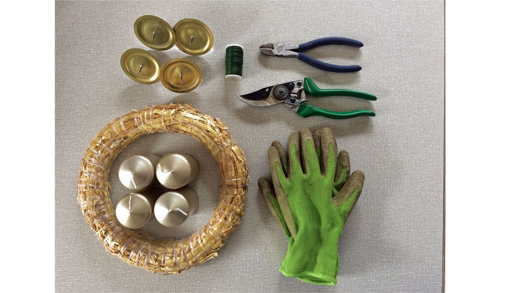 Bevor ich mit dem Basteln starten kann, benötige ich neben den Adventzweigen noch weitere Materialien für den "Adventkranz made by Andrea". Auf meinem Basteltisch liegen folgende Utensilien: