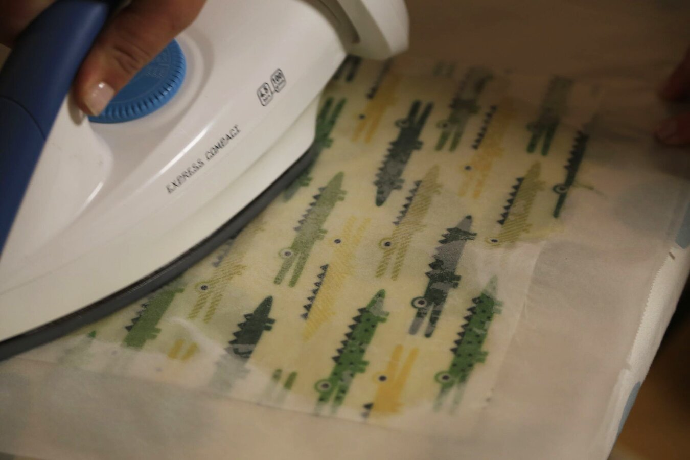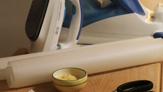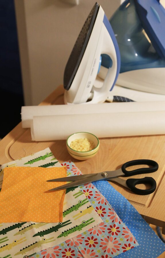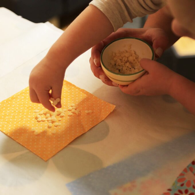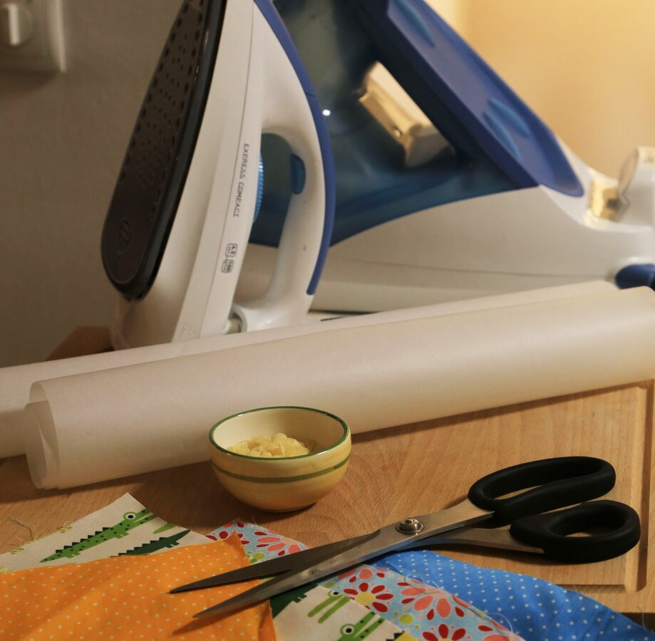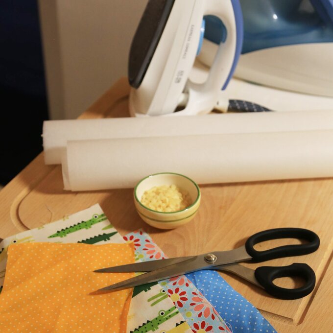 Schritt 3 Bügelbrett mit einer Lage Backpapier abdecken. Stoffstück darauflegen und einige Wachsstücke auf dem Stoff verteilen.