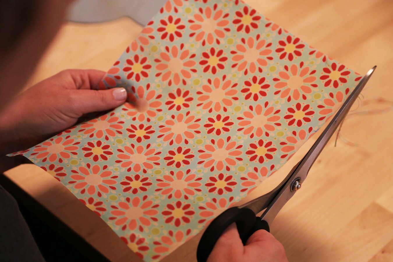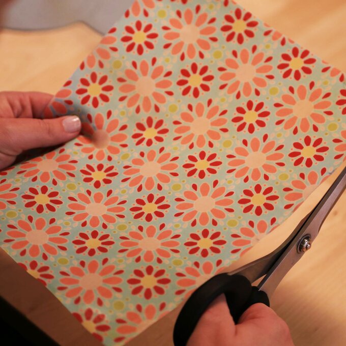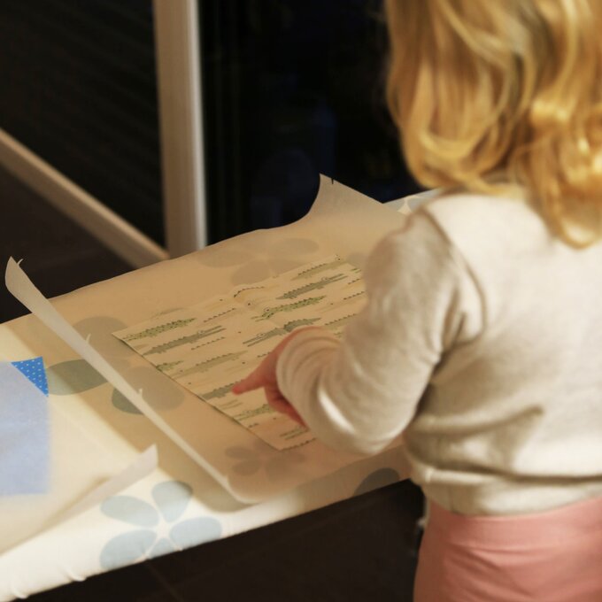 Schritt 4 Nun legst du eine Lage Backpapier oben drauf und bügelst vorsichtig auf zweithöchster Stufe. Ist das Wachs vollständig geschmolzen, dann kannst du ruhig mit etwas Druck bügeln. Mit einer Zickzackschere verleihst du dem Wunschstoff noch schöne dekorative Kanten. Und schon ist dein Wachstuch fertig!
