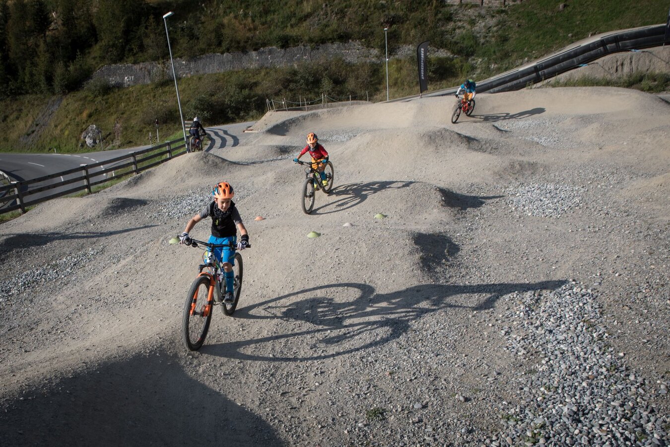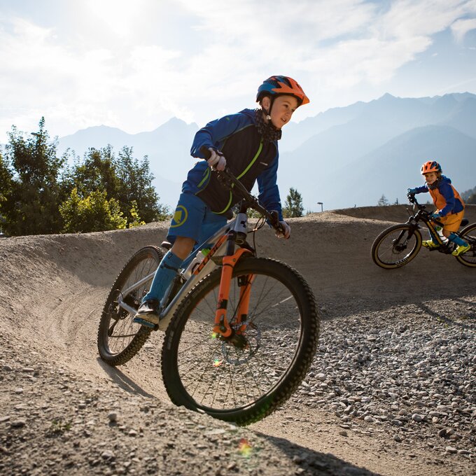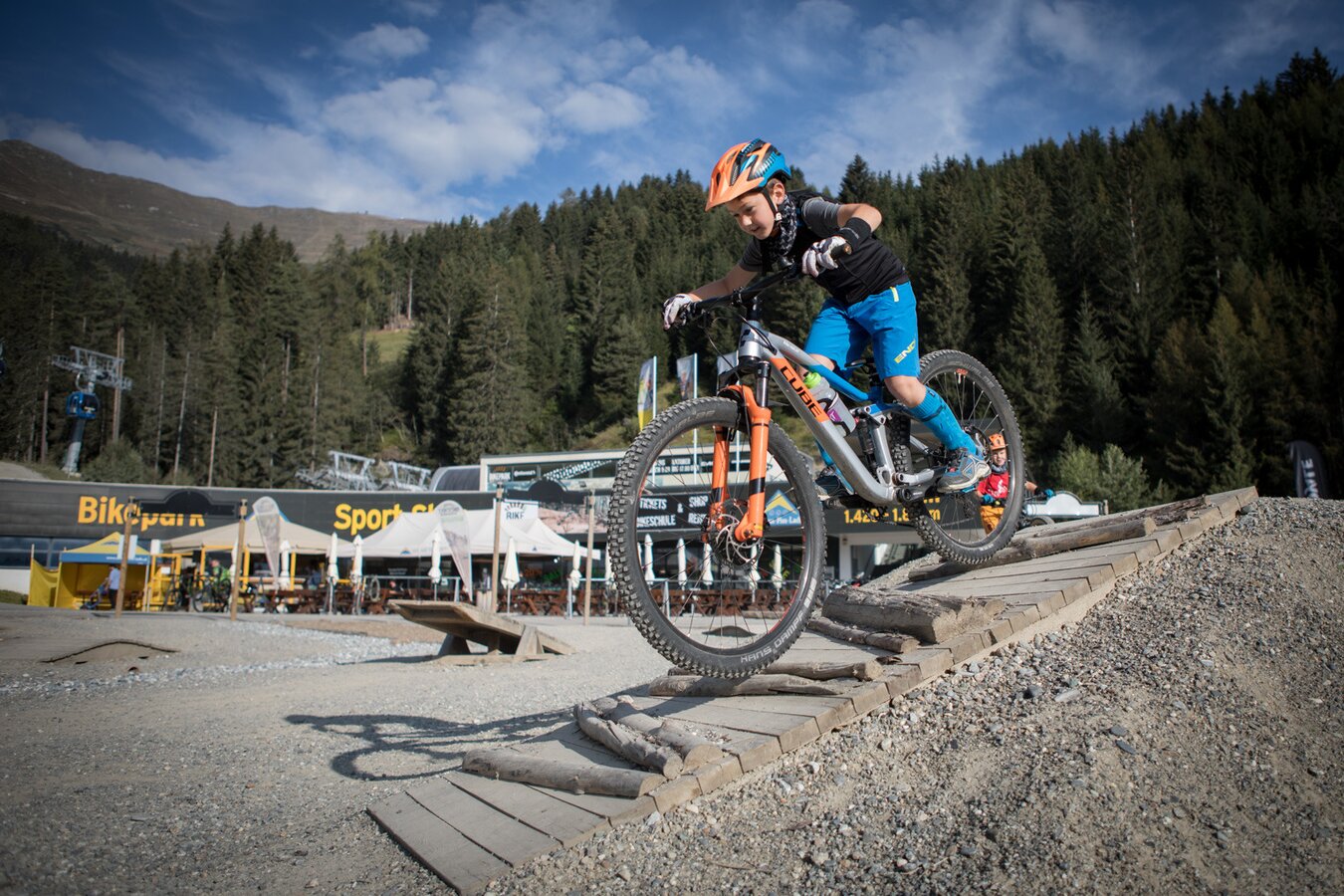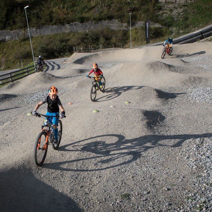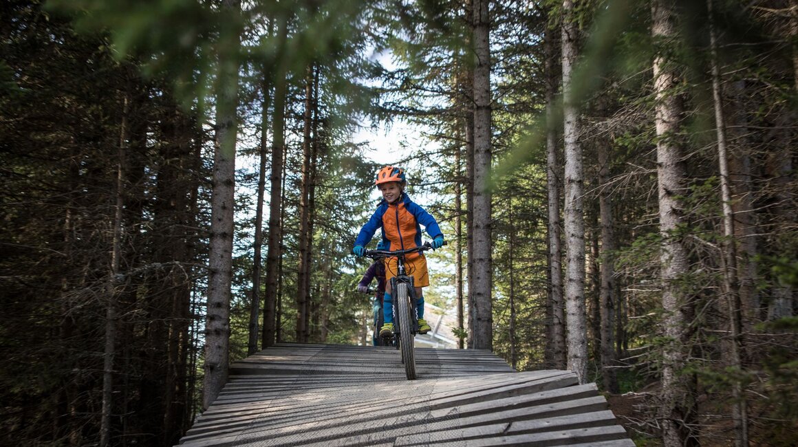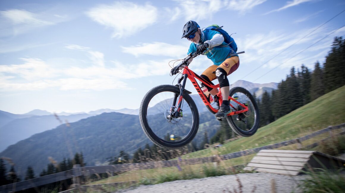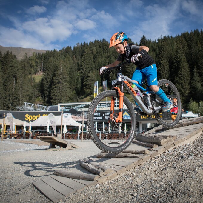 Unser Plan ist es, zuerst ein paar Runden im Bikepark auf den verschiedenen geshapten Lines zu drehen, bevor wir uns auf die hochalpinen Singletrails wagen. Wir sind bestens ausgestattet und wärmen uns sogleich im direkt vor dem Shop befindlichen Pumptrack und der angeschlossenen Training Area etwas auf. Meine Jungs lieben es, ihre Bikes über die Wellenbahn zu jagen und sich in die Kurven zu schmeißen. Da fällt es mir teilweise schon schwer, mit ihnen mitzuhalten. Doch schon nach kurzer Zeit kommt wieder einmal das Kind in mir durch und ich folge ihnen mit einem breiten Grinsen im Gesicht. Nicht nur die Wellenbahn, auch die verschiedenen Hindernisse machen richtig Spaß und eignen sich extrem gut dafür, das richtige Gefühl fürs Bike zu bekommen, um später auf den verschiedenen Lines im Bikepark Spaß zu haben.