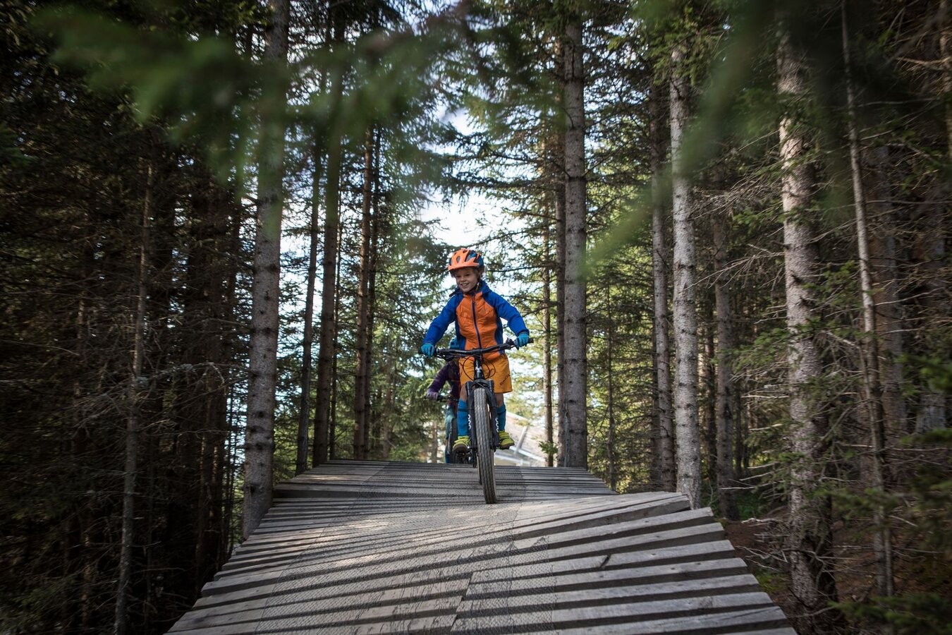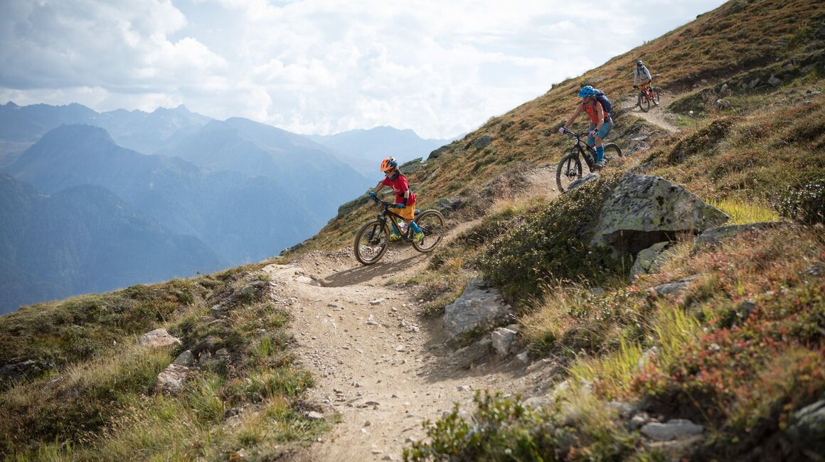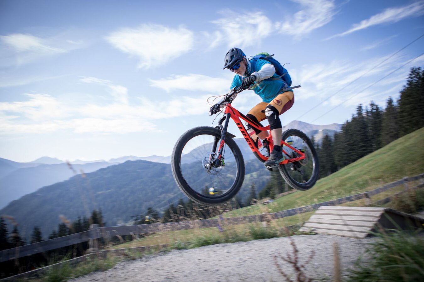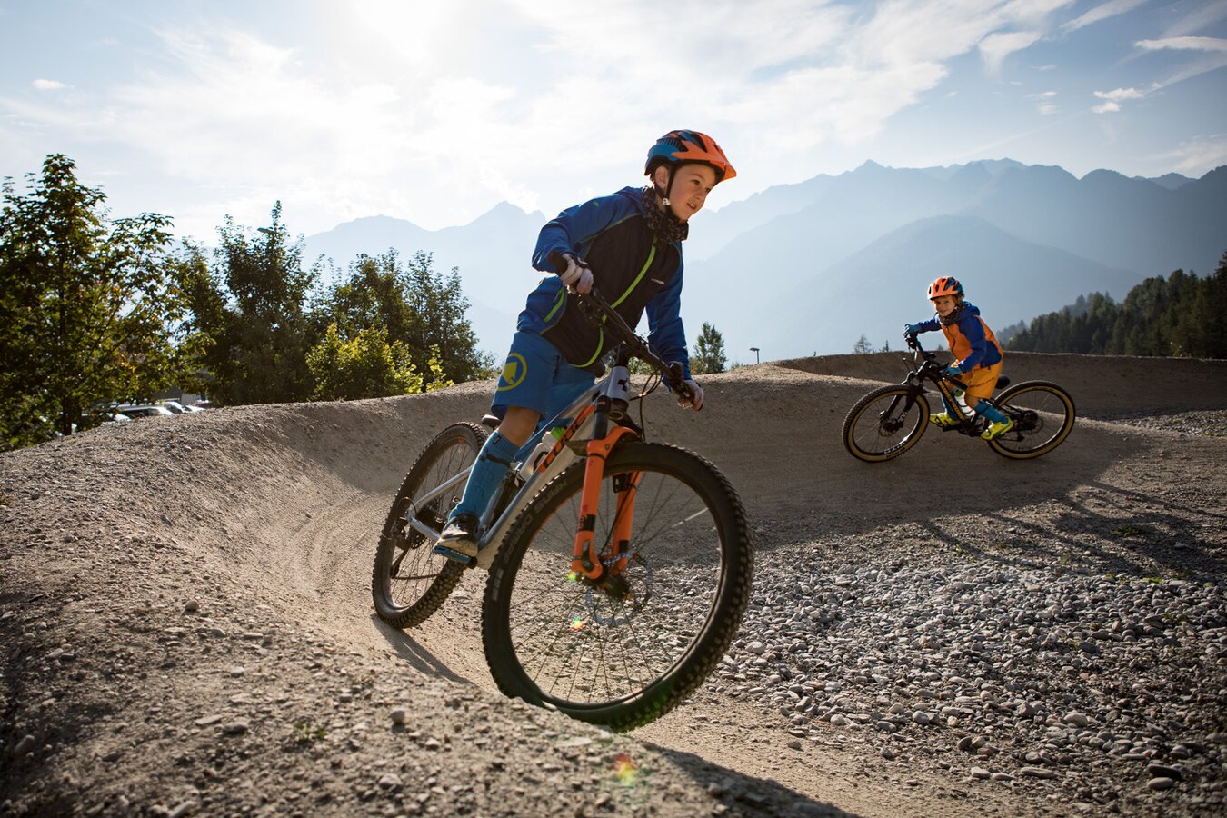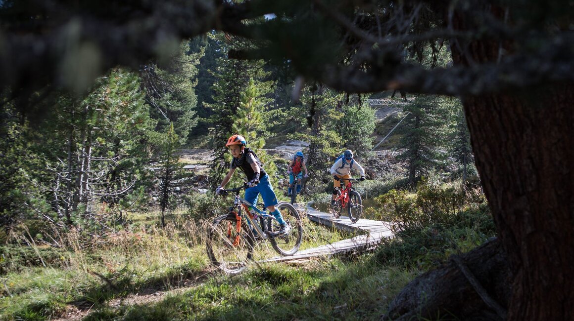 Unser Plan ist es, zuerst ein paar Runden im Bikepark auf den verschiedenen geshapten Lines zu drehen, bevor wir uns auf die hochalpinen Singletrails wagen. Wir sind bestens ausgestattet und wärmen uns sogleich im direkt vor dem Shop befindlichen Pumptrack und der angeschlossenen Training Area etwas auf. Meine Jungs lieben es, ihre Bikes über die Wellenbahn zu jagen und sich in die Kurven zu schmeißen. Da fällt es mir teilweise schon schwer, mit ihnen mitzuhalten. Doch schon nach kurzer Zeit kommt wieder einmal das Kind in mir durch und ich folge ihnen mit einem breiten Grinsen im Gesicht. Nicht nur die Wellenbahn, auch die verschiedenen Hindernisse machen richtig Spaß und eignen sich extrem gut dafür, das richtige Gefühl fürs Bike zu bekommen, um später auf den verschiedenen Lines im Bikepark Spaß zu haben.