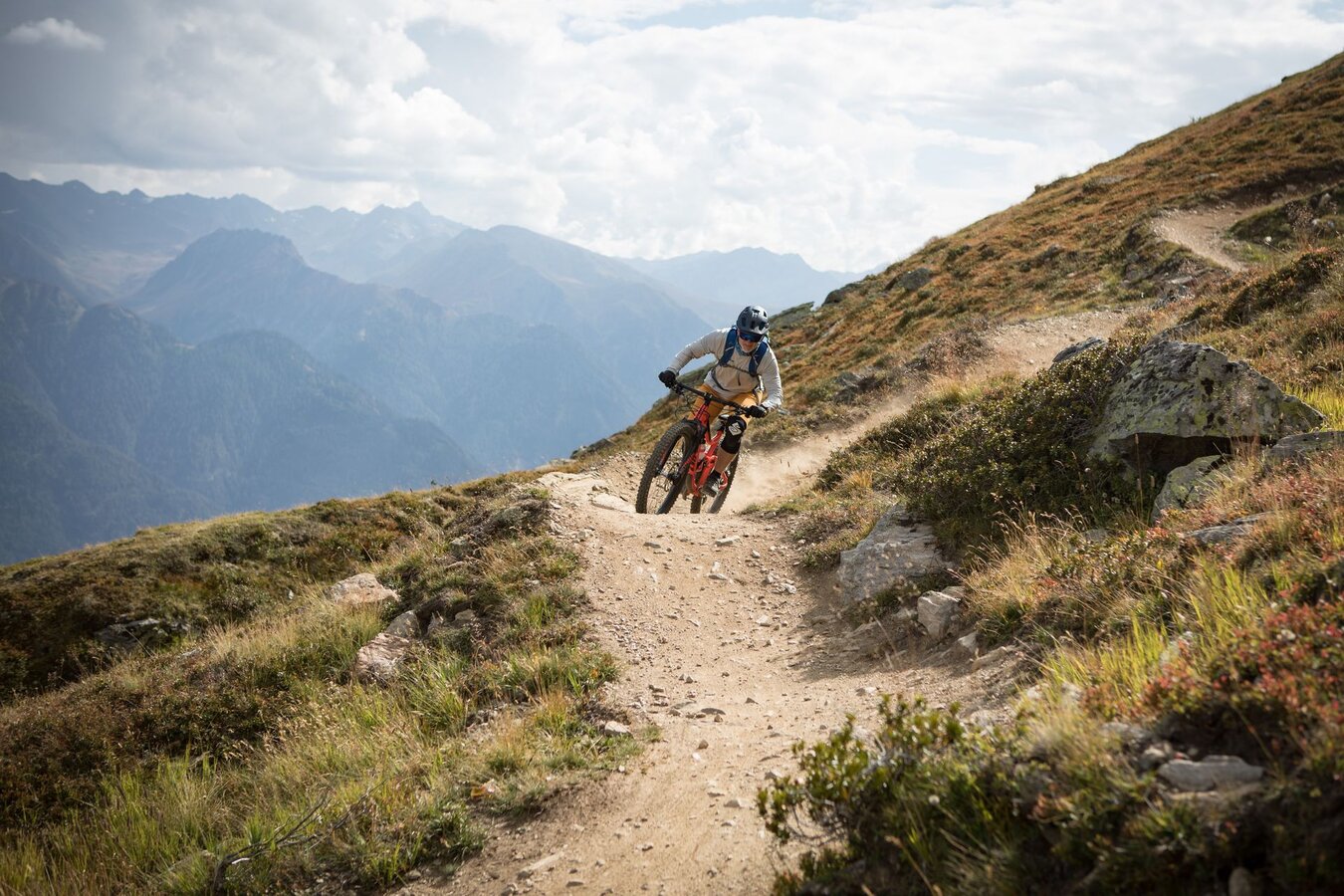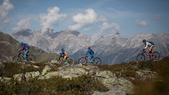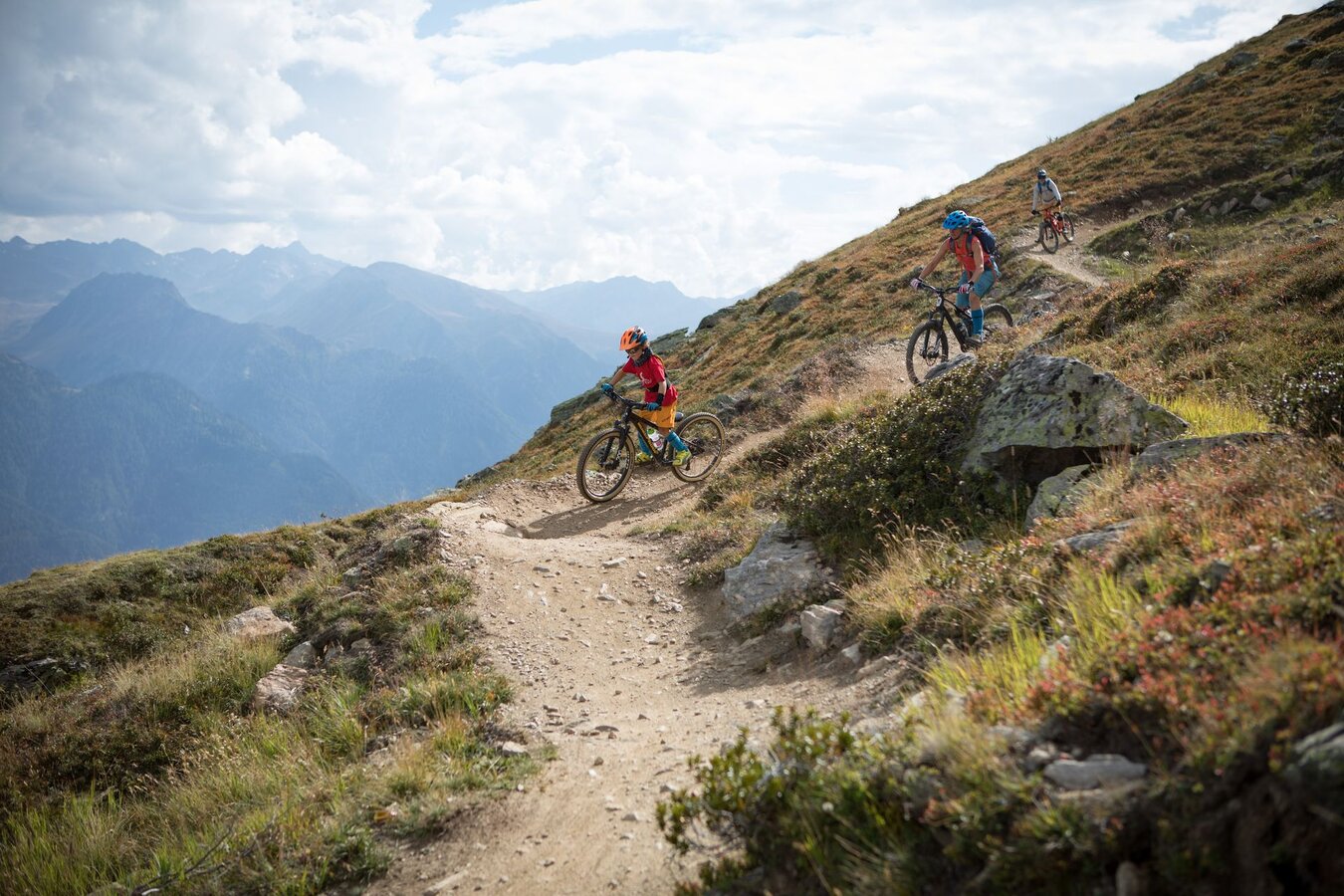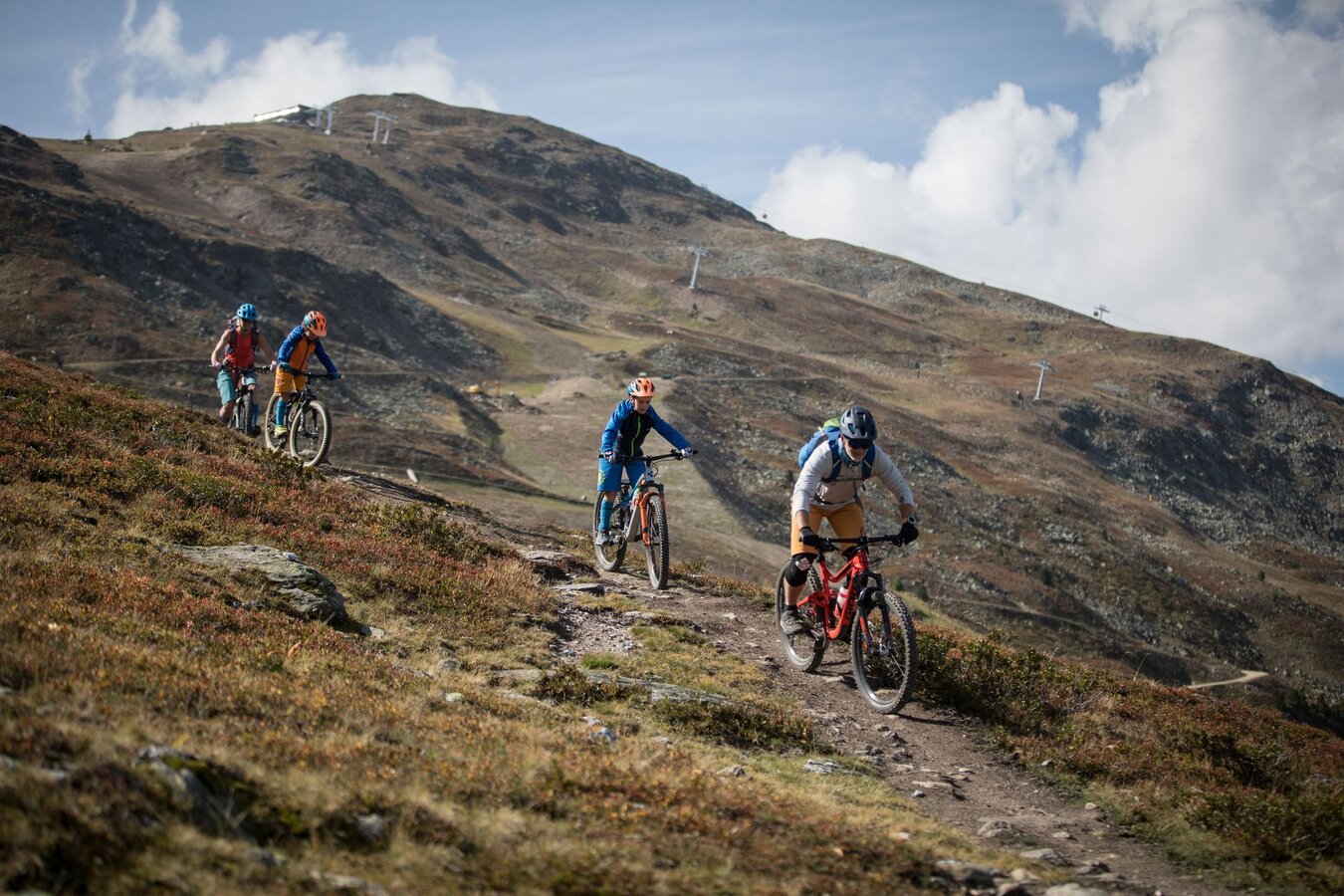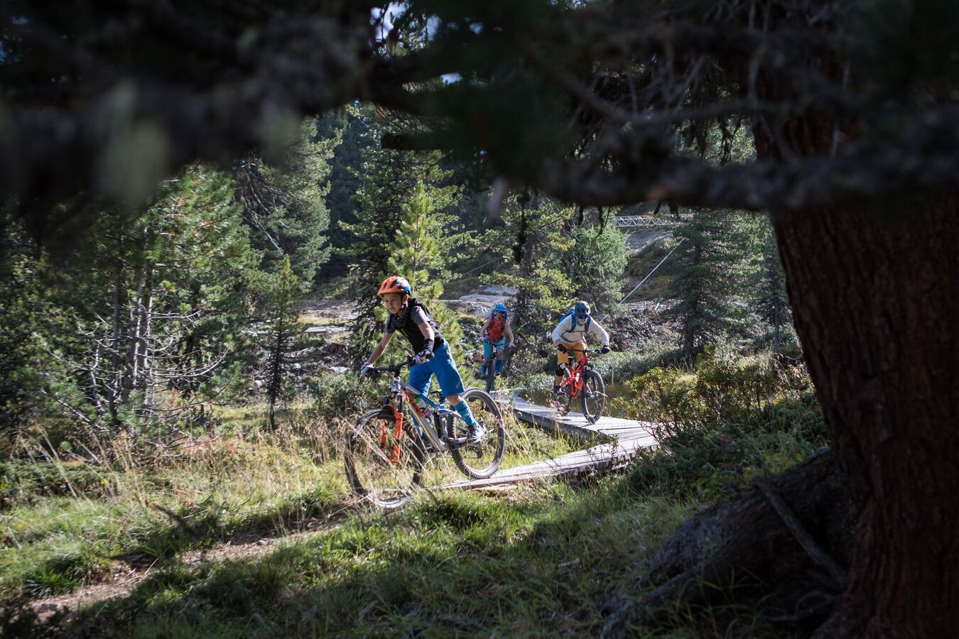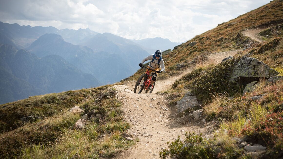 Unser Plan ist es, zuerst ein paar Runden im Bikepark auf den verschiedenen geshapten Lines zu drehen, bevor wir uns auf die hochalpinen Singletrails wagen. Wir sind bestens ausgestattet und wärmen uns sogleich im direkt vor dem Shop befindlichen Pumptrack und der angeschlossenen Training Area etwas auf. Meine Jungs lieben es, ihre Bikes über die Wellenbahn zu jagen und sich in die Kurven zu schmeißen. Da fällt es mir teilweise schon schwer, mit ihnen mitzuhalten. Doch schon nach kurzer Zeit kommt wieder einmal das Kind in mir durch und ich folge ihnen mit einem breiten Grinsen im Gesicht. Nicht nur die Wellenbahn, auch die verschiedenen Hindernisse machen richtig Spaß und eignen sich extrem gut dafür, das richtige Gefühl fürs Bike zu bekommen, um später auf den verschiedenen Lines im Bikepark Spaß zu haben.
