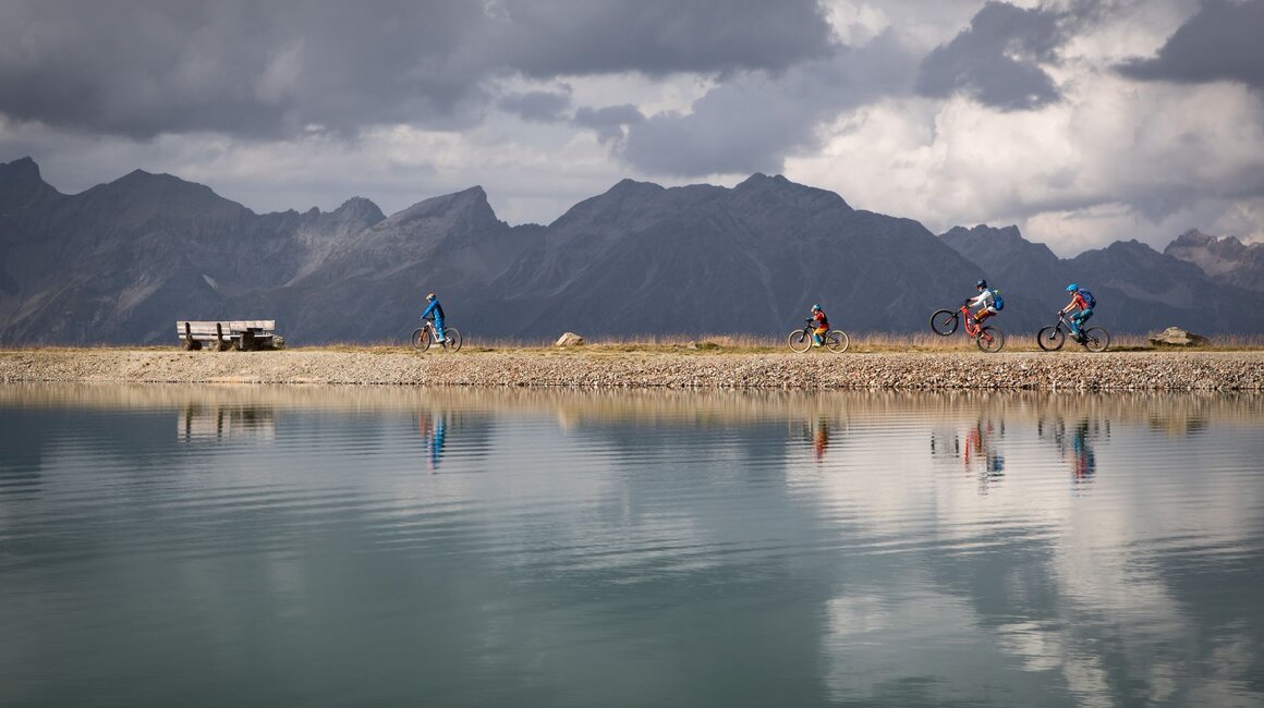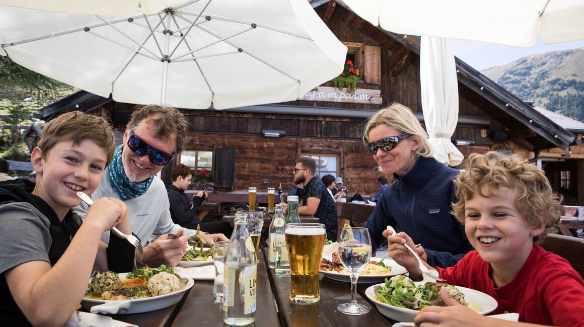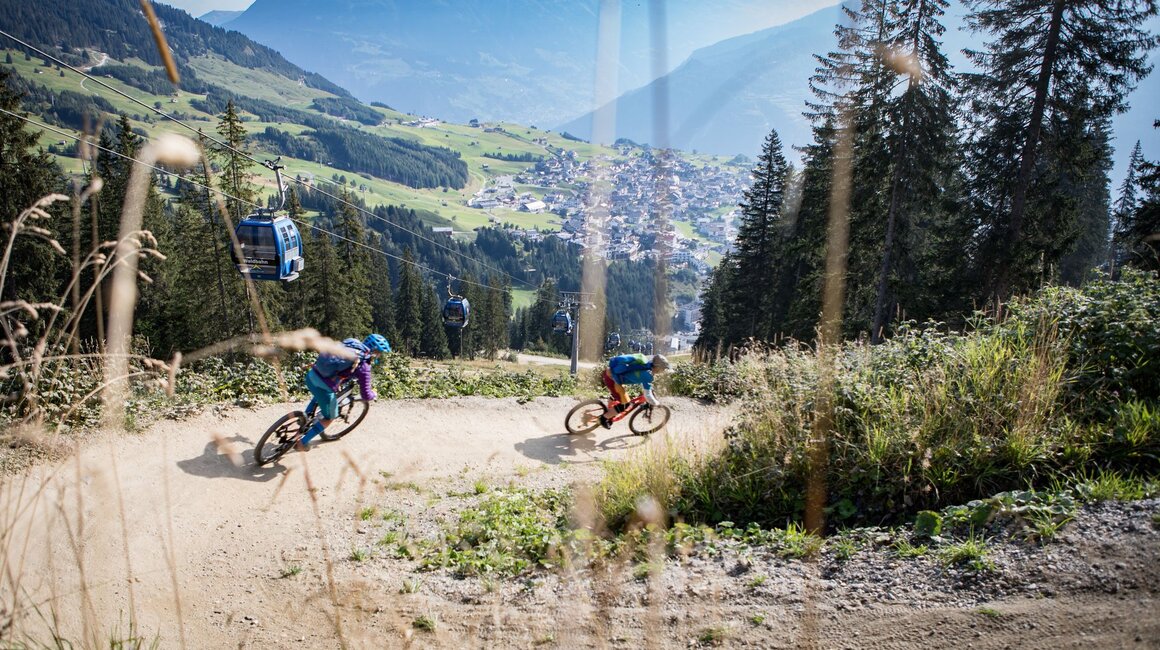 Nach einigen richtig schnellen Fahrten im Bikepark Serfaus-Fiss-Ladis schon etwas ausgepowert, beschließen wir, es etwas ruhiger anzugehen und die Singletrails auf der Fisser Nordseite zu erkunden. Normalerweise ist auf den Singletrails etwas weniger los und man kann daher etwas entspannter fahren. Außerdem wollen wir in der sehr schön gelegenen Schöngampalm zu Mittag essen und die erreicht man eben am besten über den mit „leicht“ gekennzeichneten Zirbentrail. Also treten wir das kurze Stück ins Zentrum von Fiss und fahren, Corona-bedingt, „bemaskt“ mit der Gondel hinauf auf das Fisser Joch. Es fällt wieder auf, wie freundlich und hilfsbereit das Liftpersonal ist, sodass es auch für meine zwei Jungs kein Problem ist, ihre Bikes in die Gondeln zu bringen.