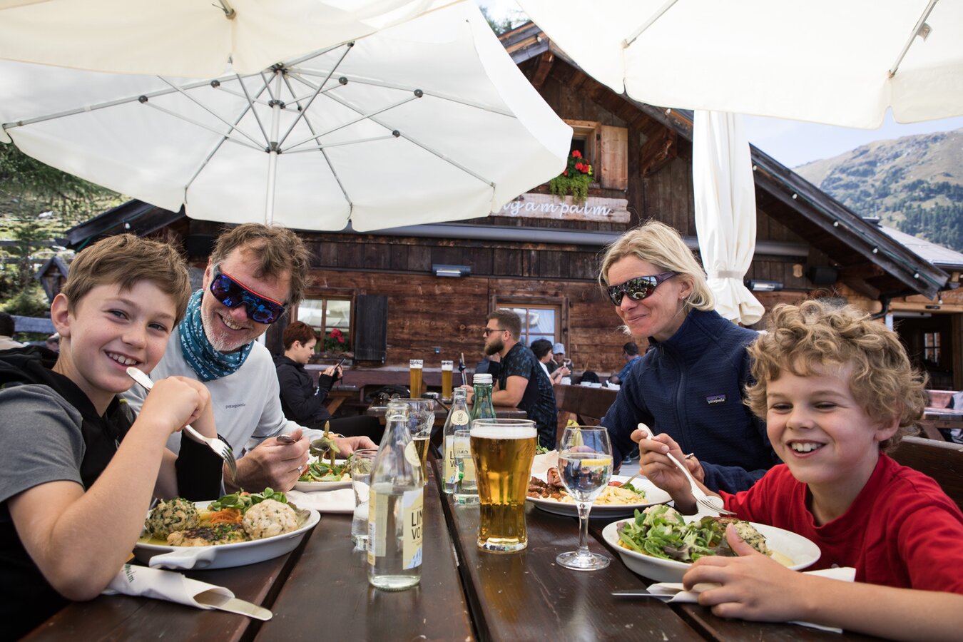 Zufrieden, mit leeren Muskeln und voll mit schönen Eindrücken und guten Gefühlen, rollen wir durch den Ortskern von Fiss. Noch lange nicht sind wir alle ausgeschilderten Trails und Bikepark-Lines gefahren. Es gäbe noch so viel zu entdecken, aber der heutige Tag neigt sich dem Ende zu und so bleibt uns wohl nichts anderes übrig, als baldestmöglich wieder zu kommen. Und wer weiß, das nächste Mal treten wir vielleicht selber rauf, denn auch dies ist hier, dank des guten Wegenetzes, möglich. Im Auto sitzend, höre ich von der hinteren Sitzbank nur ein leises „wår des a cooler Tåg“, bevor beiden Jungs die Augen zu fallen und sie fast zeitgleich einschlafen. Teresa greift nach meiner Hand und meint: „Solche Tage liebe ich! Stressfrei und für jeden etwas dabei!“