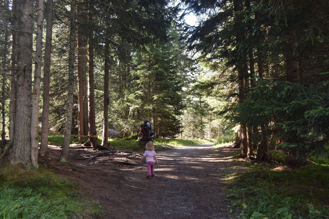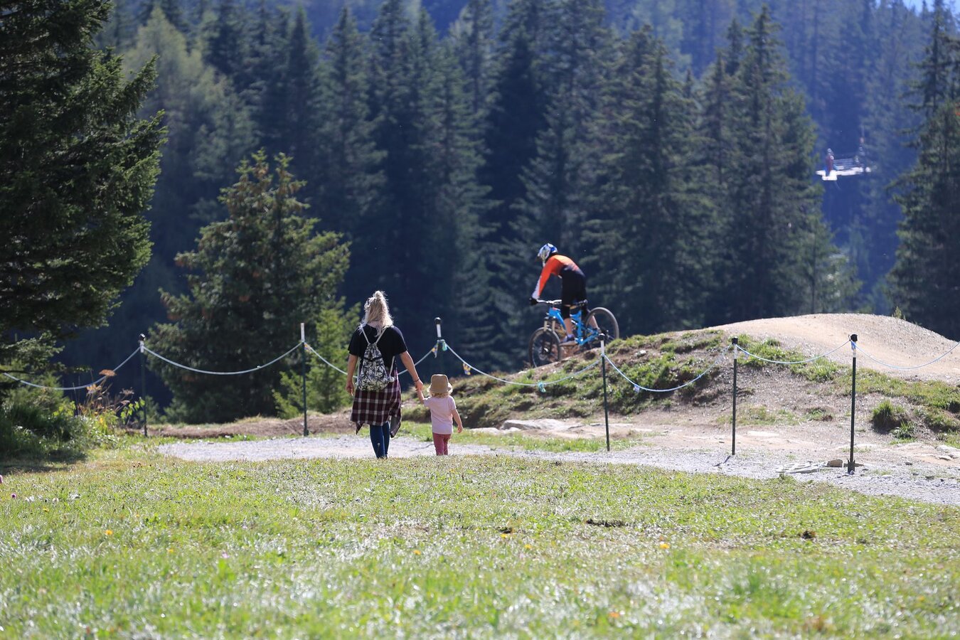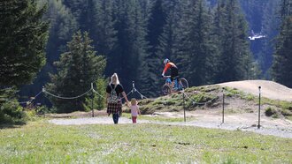 “Goti, Beerla!“ Die Kinderaugen leuchten fröhlich als sie die Waldbeeren und prächtigen Blumen entdeckt. Natürlich lassen wir die Pflanzen stehen, da viele streng geschützt sind und in der freien Natur nicht gesammelt oder beschädigt werden dürfen. Bereits am Ende des Waldes offenbart sich eine eindrucksvolle Landschaft und auch das Ziel können wir schon sehen. Je weiter wir hinauskommen, desto mehr öffnet sich der wunderbare Blick in Richtung Fiss und Serfaus. An der Abzweigung bei dem Aussichtspunkt beschließen wir eine kurze Rast zu halten und dann noch weiter Richtung Waldbahn nach Fiss zu wandern, wo man wagemutige Downhiller beim Springen im Bikepark Serfaus-Fiss-Ladis beobachten kann. 1, 2, 3, looos! Antonia hat sichtlich Spaß daran und klatscht nach jedem Sprung.