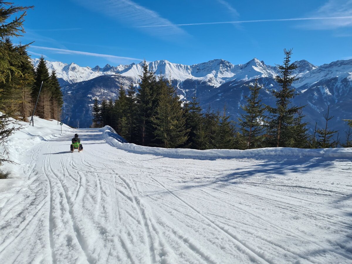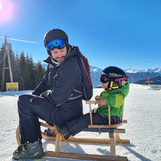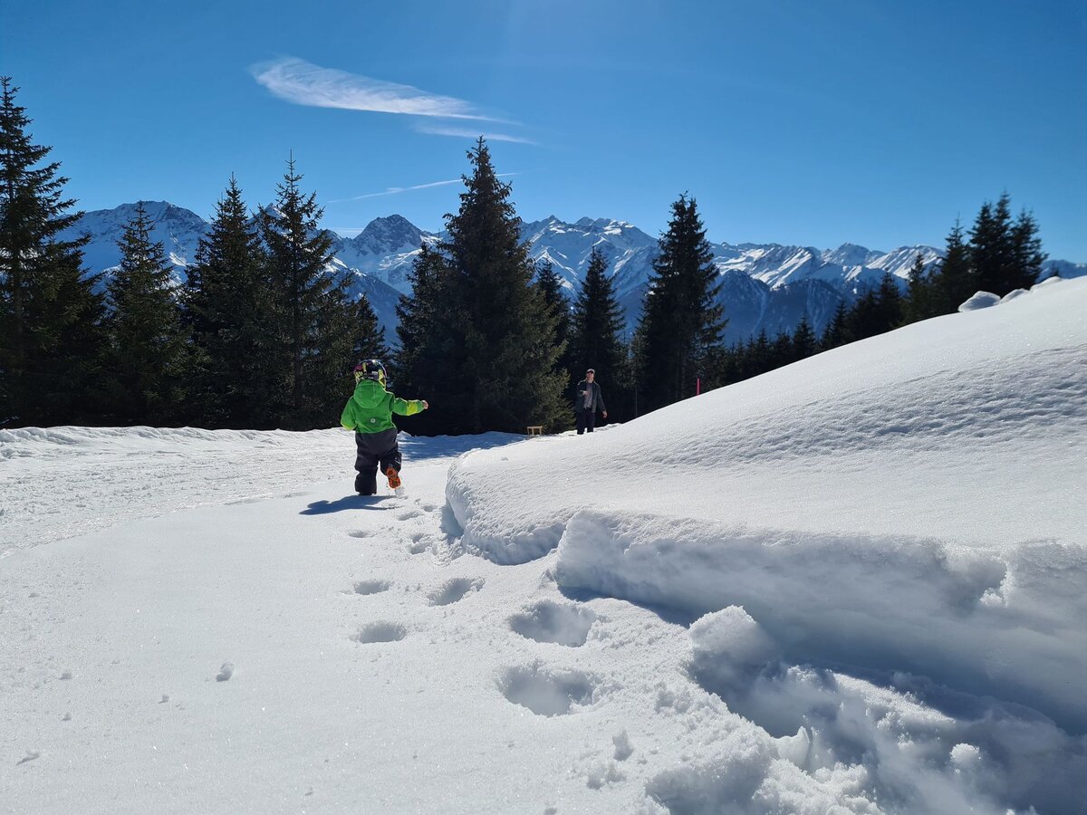Dieser Themenweg ist sehr EMPFEHLENSWERT. Er ist breit angelegt und leicht zu erkunden, da er nur leicht abfallend ist. Damit beim Wandern auch bei größeren Kids keine Langweile aufkommt, bieten die Stationen, die den Sinnen einen Streich spielen, genügend Raum für Abenteuer. Hast du so einen kleinen Zwerg wie ich dabei? Dann nimm am besten eine Rodel mit, da besonders die kleinen Weltentdecker gerne schnell müde werden. Für Abwechslung sorgt die Möglichkeit, am Ende auf der Rodelbahn Fiss ins Tal zu gelangen. Auch im Sommer lädt der Fisser Kraft- und Sinnesweg zu einer interaktiven Familienwanderung ein und ist sogar mit Kinderwagen erlebbar. Was wohl Konstantins Lieblingsfarbe beim Wandern ist? SCHNEEWEISS oder doch WIESENGRÜN?