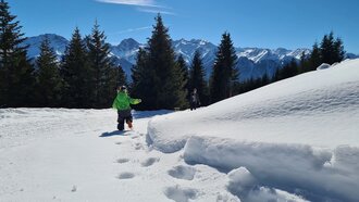 Entlang des Weges gibt es zahlreiche Möglichkeiten, um eine Pause einzulegen und Platz zu nehmen. Auch wir suchen uns ein sonniges Plätzchen. Wir genießen die Aussicht, toben im Schnee und prosten uns mit unseren mit Tee gefüllten Thermoskannen zu. Ich werde wieder schwach und lasse mich von dem Zweieinhalbjährigen überreden, ihm einen "Gutz" zu geben, also etwas zum NASCHEN, und krame in meinem Rucksack danach. Zum Glück werde ich fündig. Auch ich gönne mir ua Gutzala. Zufrieden lauschen wir entspannt dem Vogelgezwitscher. Wir zwei Männer schweigen, genießen und lassen das bisher Erlebte Revue passieren.