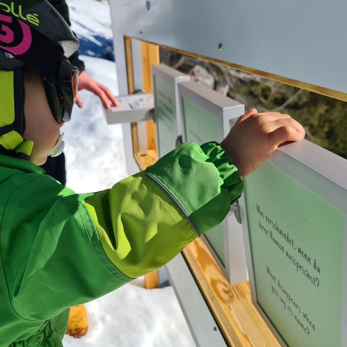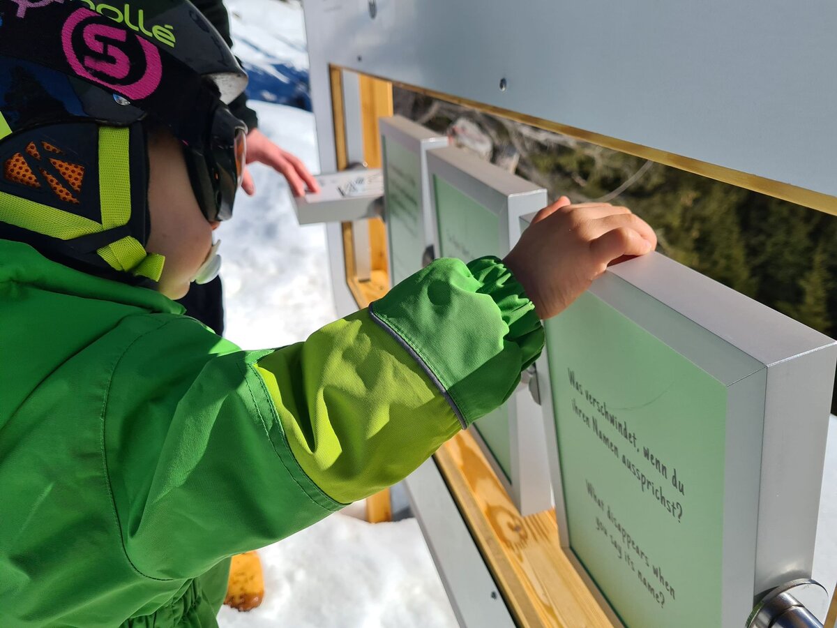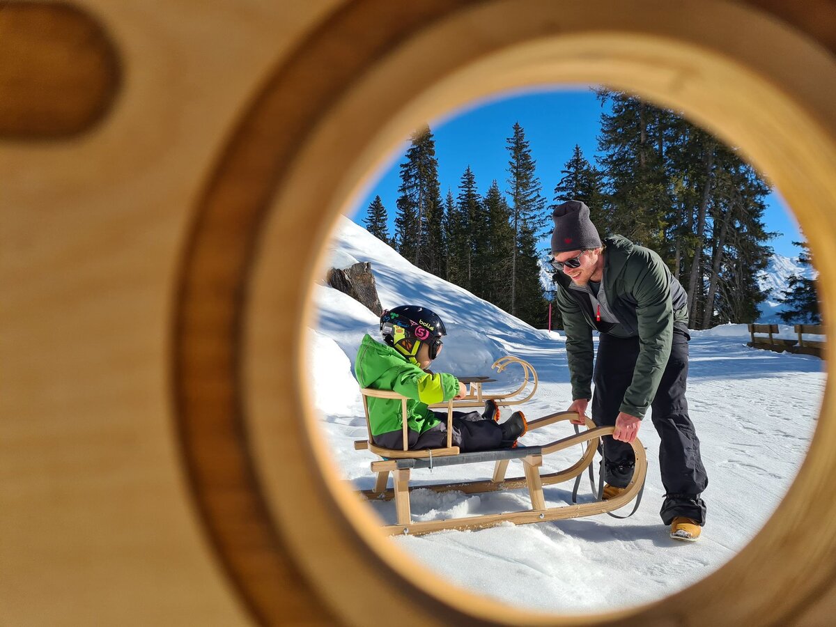 Zwischen den Rodel- und Wanderpassagen gibt es viel zu entdecken. Ein vermeintliches FERNGLAS etwa steht vor einem wunderschönen Panorama. Durch die Öffnung sehen wir allerdings keine Berge und Schneelandschaften. Neugierig "gigglat" Konstantin durch die Röhre.