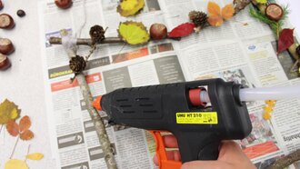 Mit der Heißklebepistole befestigst du die gesammelten Naturmaterialien rund um den Rahmen. Achte darauf, die Materialien abwechslungsreich anzuordnen, damit ein schöner, bunter Effekt entsteht.