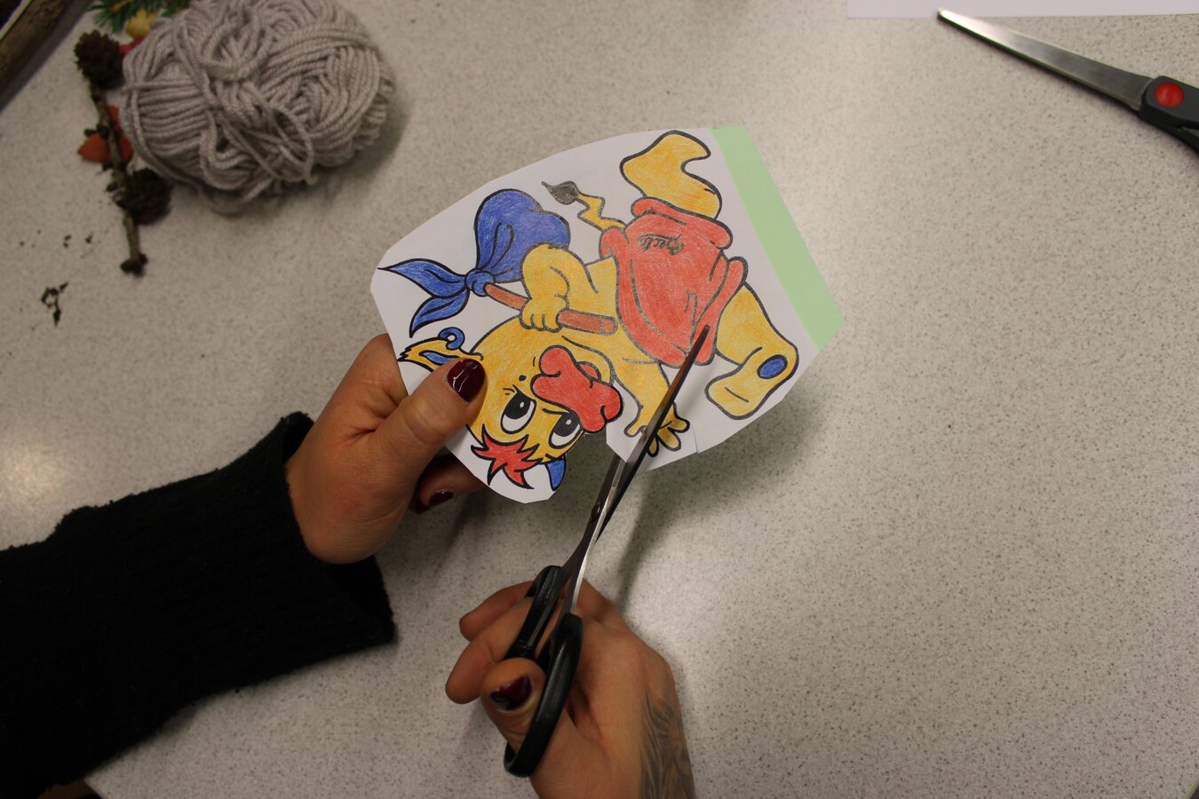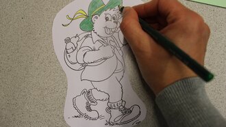 In der Mitte des Rahmens spazieren Murmli und Berta. Such dir eine Malvorlage auf der Murmli & Berta Website aus und drucke sie aus. Mit Buntstiften malst du sie bunt aus. Zur besseren Stabilität klebst du sie auf Tonkarton, schneidest sie anschließend aus und klebst sie auf den unteren Stock.