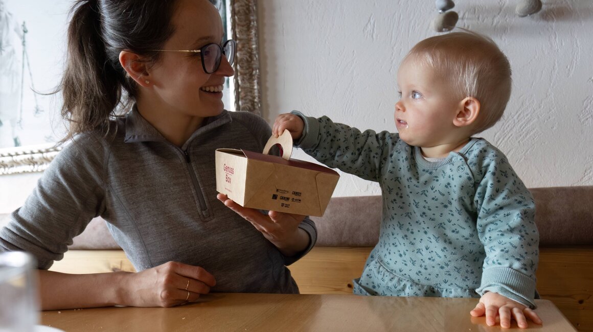 Nach der sehr leckeren Pizza gibt's noch Kuchen und Strudel zum Nachtisch. Die Fisser Bergbahnen haben nämlich eine eigene Bergkonditorei und rühren, dekorieren und rollen ihre Leckereien täglich frisch. Das muss man uns natürlich nicht zweimal sagen und wir lassen unseren Tag ohne schlechtes Gewissen süß ausklingen. Nachhaltig: Wenn die Augen mal größer waren als der Hunger, dann kann das Essen einfach in einer Genussbox aus Karton mitgenommen und später genossen werden.