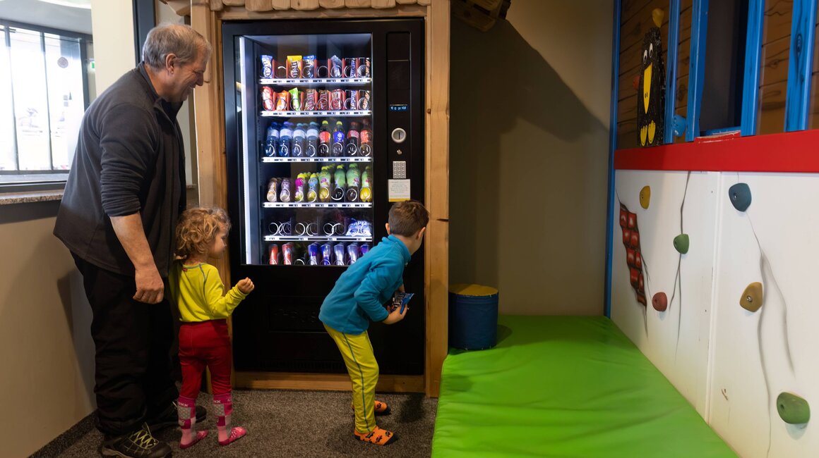 Was ich praktisch finde ist, dass es im Spielebereich zum einen die Möglichkeit gibt, mitgebrachtes Essen und Getränke auf Sofas einzunehmen, zum anderen kann man sich an einem Getränke- und Snackautomaten bedienen. Ein Glück, dass Opa heute das notwendige Kleingeld in der Tasche hat. Ausgesucht wird aber eine Etage niedriger: Zwei seiner Enkel treffen die Wahl. Was außerdem positiv auffällt: Vor Ort gibt es Schließfächer, in die mit Münzeinwurf das wertvolle Hab und Gut sicher versperrt werden kann. Moneten in bar sollte man also immer dabei haben.