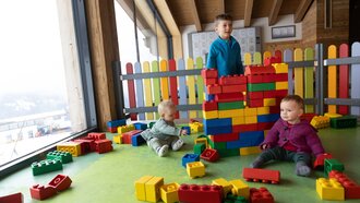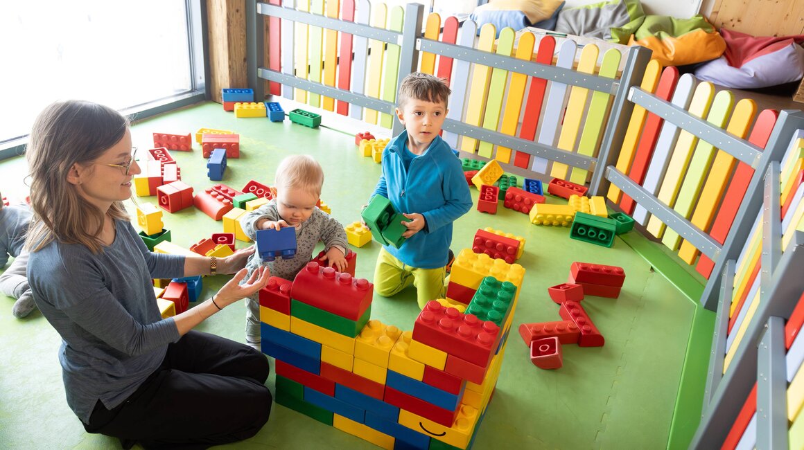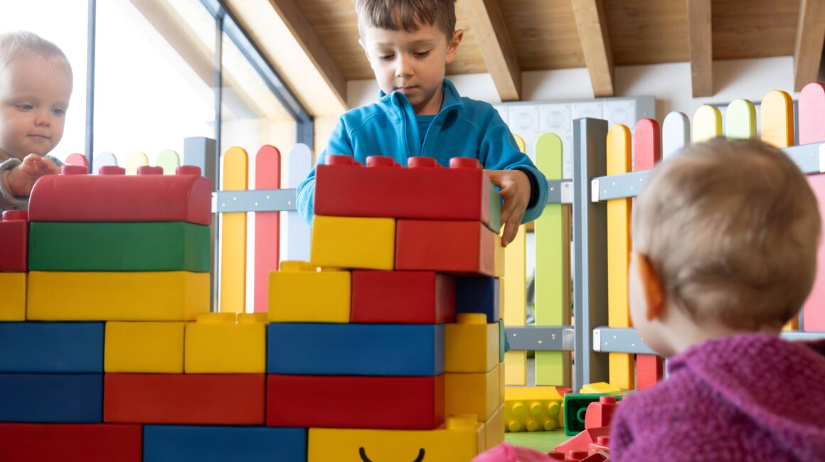 Direkt am Fenster befindet sich ein Bereich, der sich besonders für kleine Kinder eignet. Der Boden ist gut gepolstert und die Bausteine bestehen aus weichem Schaumstoff. Eine Burg ist mit kleinen und großen Händen schnell gebaut.