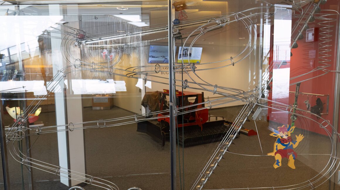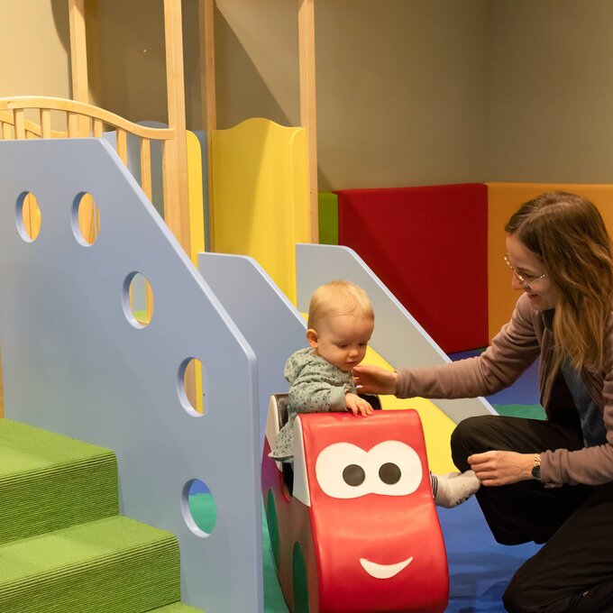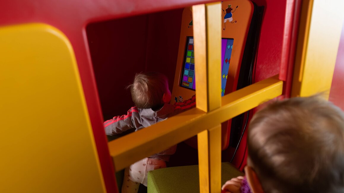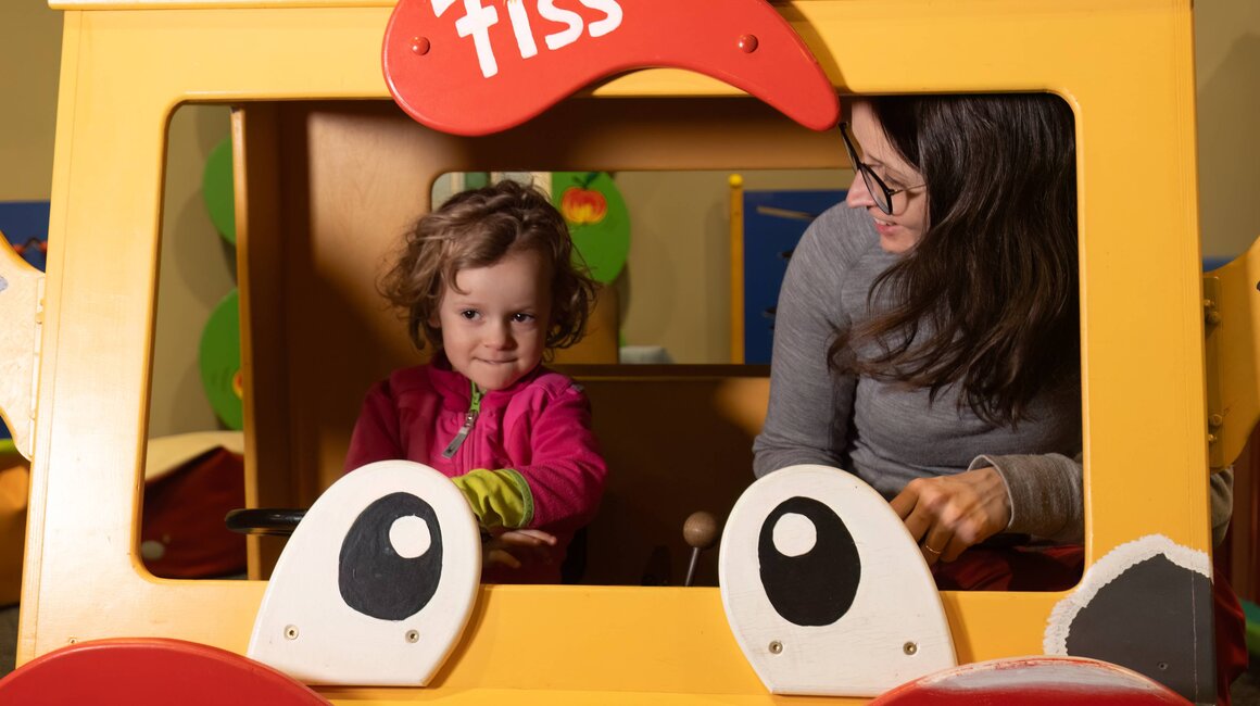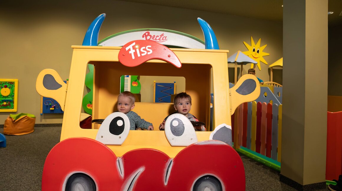 Unser erster Eindruck: Der Spielebereich wirkt einladend. Er ist offen, hell und mit Glasscheiben vom Eingangsbereich getrennt. Dort lädt ein knallroter Pistenbully aus Holz zum Einsteigen ein. Unser männlicher Tester nimmt sofort Platz und startet sozusagen die Inspektion.