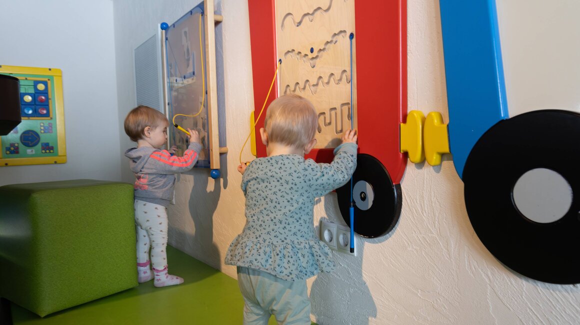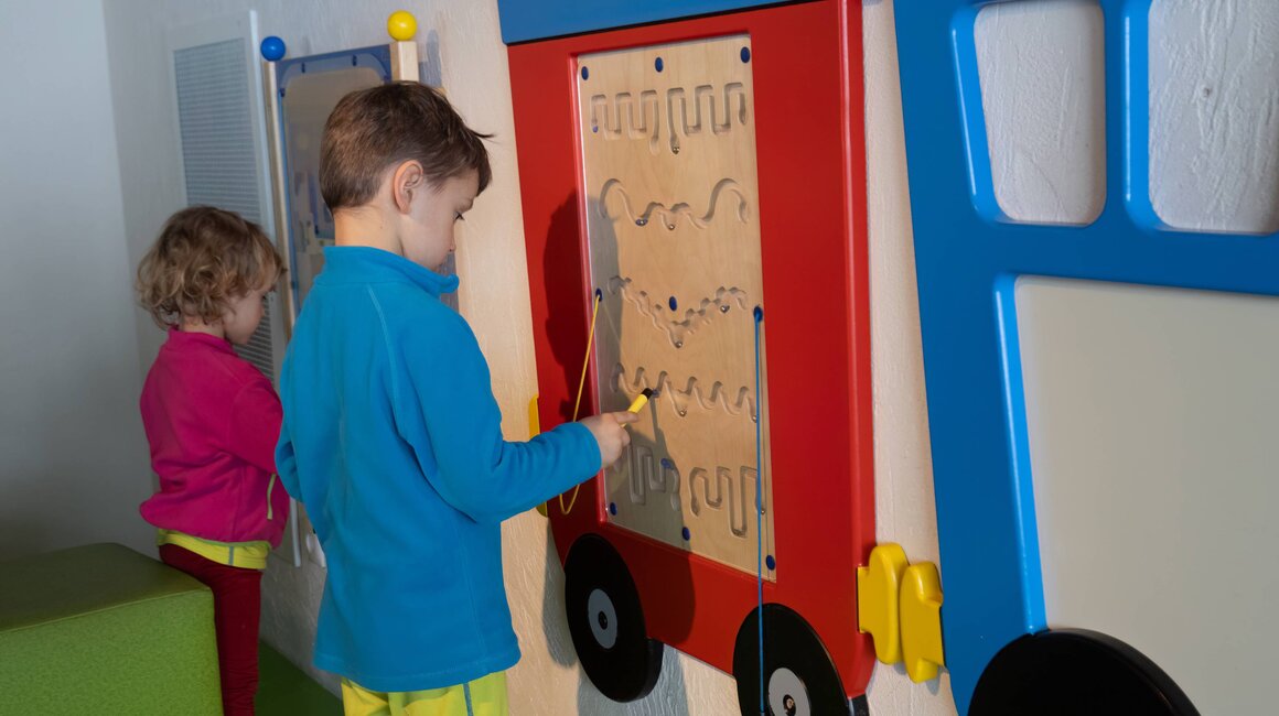 Was mir als Mama einer 1-jährigen besonders gut gefällt ist, dass sich an den Wänden interaktive Spielestationen befinden, bei denen unterschiedliche Fähigkeiten gefragt sind. Das Wichtigste aber: Die Höhe der Stationen ist an die Größe der spielenden Kinder angepasst. Alles in allem eignen sich daher alle Spielestationen im Fisser Skidepot für Kinder unterschiedlichen Alters. Langeweile kommt bei uns nicht auf.