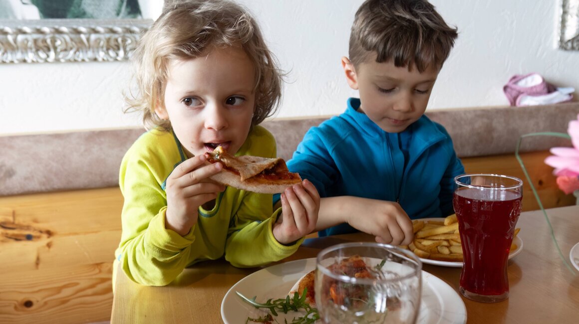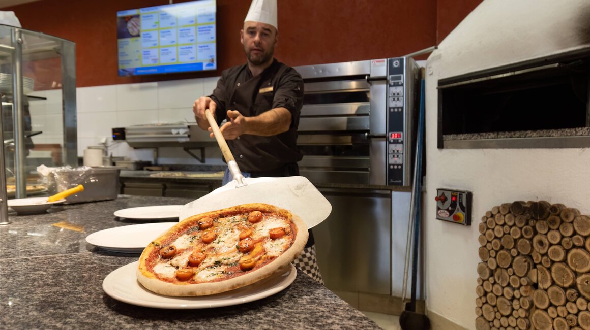 Pünktlich um 12.00 Uhr knurren unsere Mägen und wir machen uns auf den Weg ins darunterliegende Restaurant. Bekannt ist die Sonnenburg unter anderem für ihre Pizzen. Zu recht? Auch das wollen wir heute herausfinden und bestellen neben Pommes – die gehen schließlich immer – verheißungsvolle Pizzen zum Teilen.