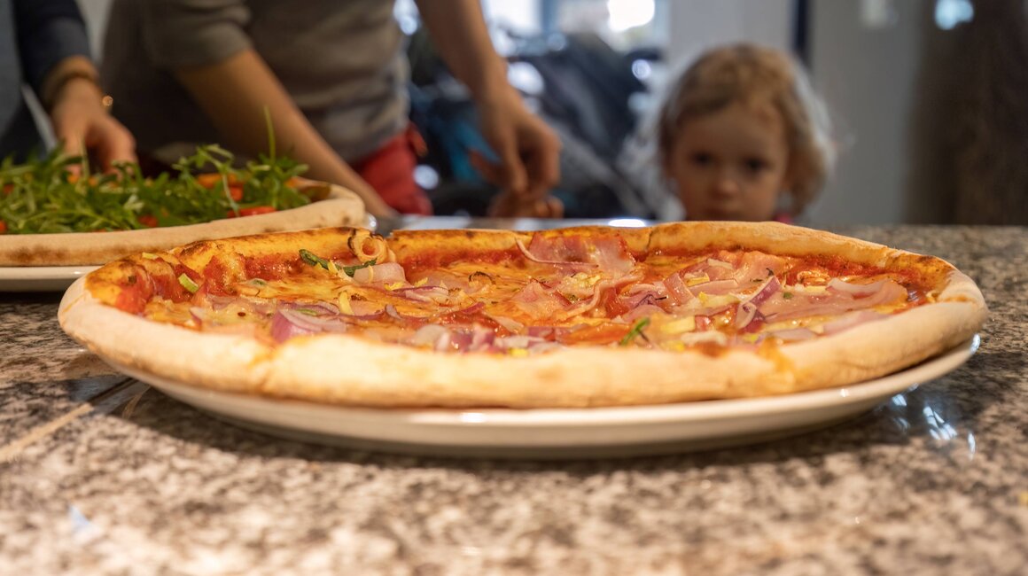 Abgeholt werden die leckeren Stücke direkt beim heißen Holzofen und werden auf Wunsch in Stücke geschnitten. Unsere Tellerfracht tragen wir anschließend ungeduldig nach oben. Direkt an den Spielebereich grenzt nämlich ein separater - in Glas gefasster - Essbereich für Familien. Dort findet unser Mahl statt.
