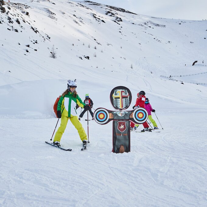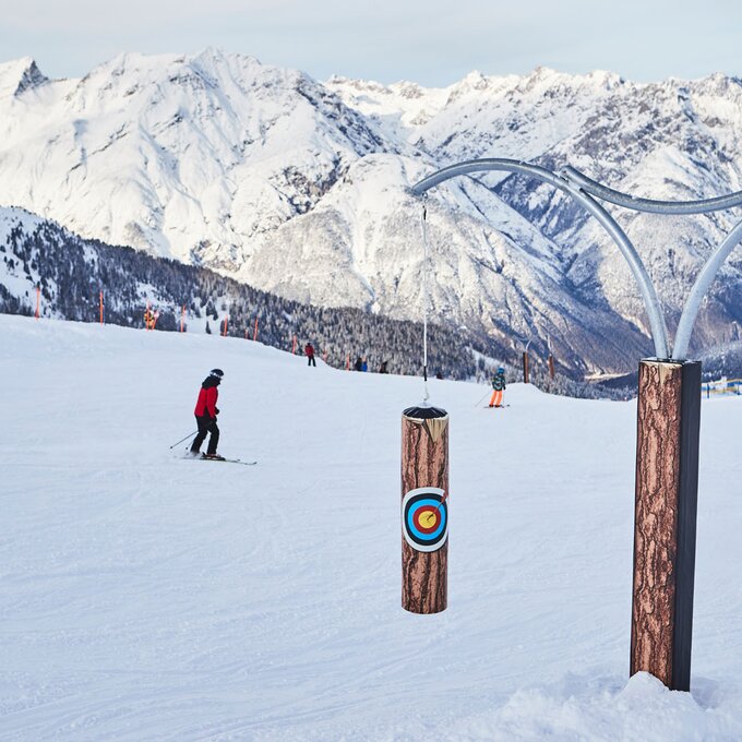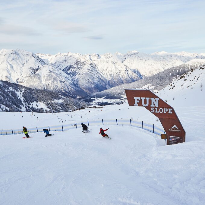 Los geht's an der großen Fun Slope-Tafel auf der Fisser Nordseite (Plazörabfahrt Nr. 21). Dort erwarten dich Sprünge, Wellen, Boxen, ein Tunnel und eine Schneeschnecke. Wenn du das alles gemeistert hast, kannst du noch mit einem High Five abklatschen. Du bist ein wahres Energiebündel und dein Action-Akku ist immer noch nicht voll geladen? Dann ab zum Airbag im Snowpark Fiss! Dort kannst du deine coolsten Jumps zeigen. Kleine Skizwerge wie Valerie und Elias fühlen sich aber auf der Fun Slope so wohl, dass sie gleich noch mal fahren wollen.