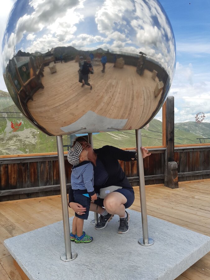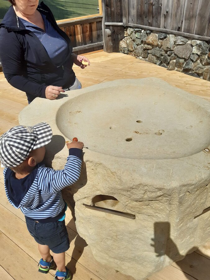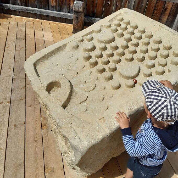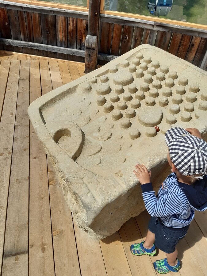 Dem kleinen Eduard haben es besonders die Kugeln aus Naturmaterialien angetan. Diese sind im interaktiven Erlebnisareal ständige Begleiter. Erhältlich am „Steinspender“ im Eingangsbereich, kommen die Murmeln an verschiedenen Spielstationen zum Einsatz. Und in der großen Kugel aus Spiegelglas kann man sich so gut selbst entdecken. Was für ein Spaß!