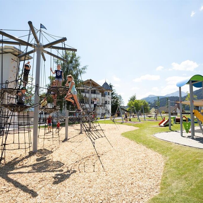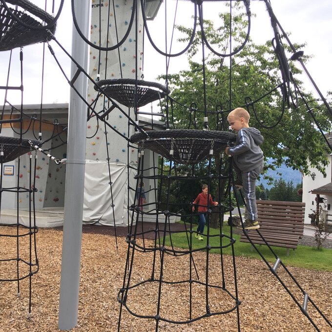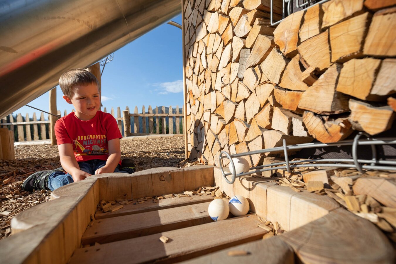 Gerade an heißen Tagen herrschen hoch oben am Lassida angenehme Temperaturen und es kann ohne groß schwitzen zu müssen herumgetollt werden. Der gigantische Panoramablick ist hier Programm. Verena liebt es, es sich in einer der zahlreichen Relaxstationen so richtig gemütlich zu machen, während die Jungs unbeschwert über den Motoriktrail sausen können. In dem ausgeklügelten Parcours ist neben Geschicklichkeit und Beweglichkeit auch Balance gefragt. Während der schon etwas ältere Eduard bereits selbst seine Touren machen kann, benötigt der jüngere Benjamin noch etwas "erwachsene" Unterstützung. Aber mit ein wenig Hilfe geht das schon ganz gut.