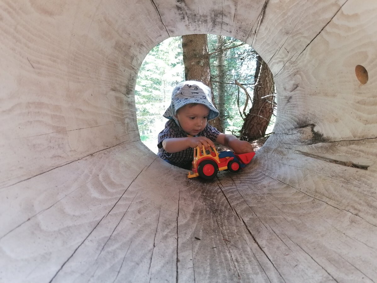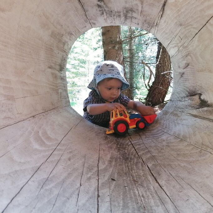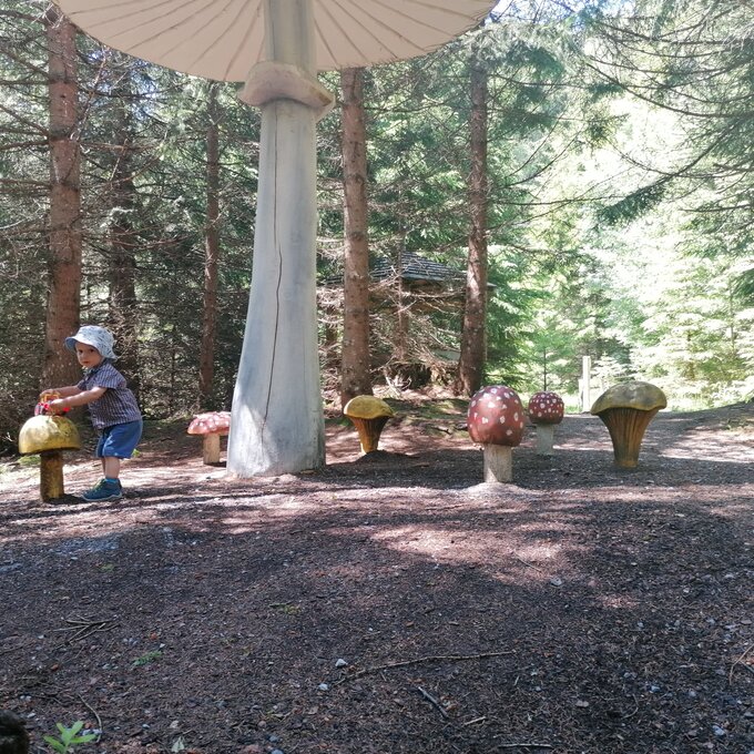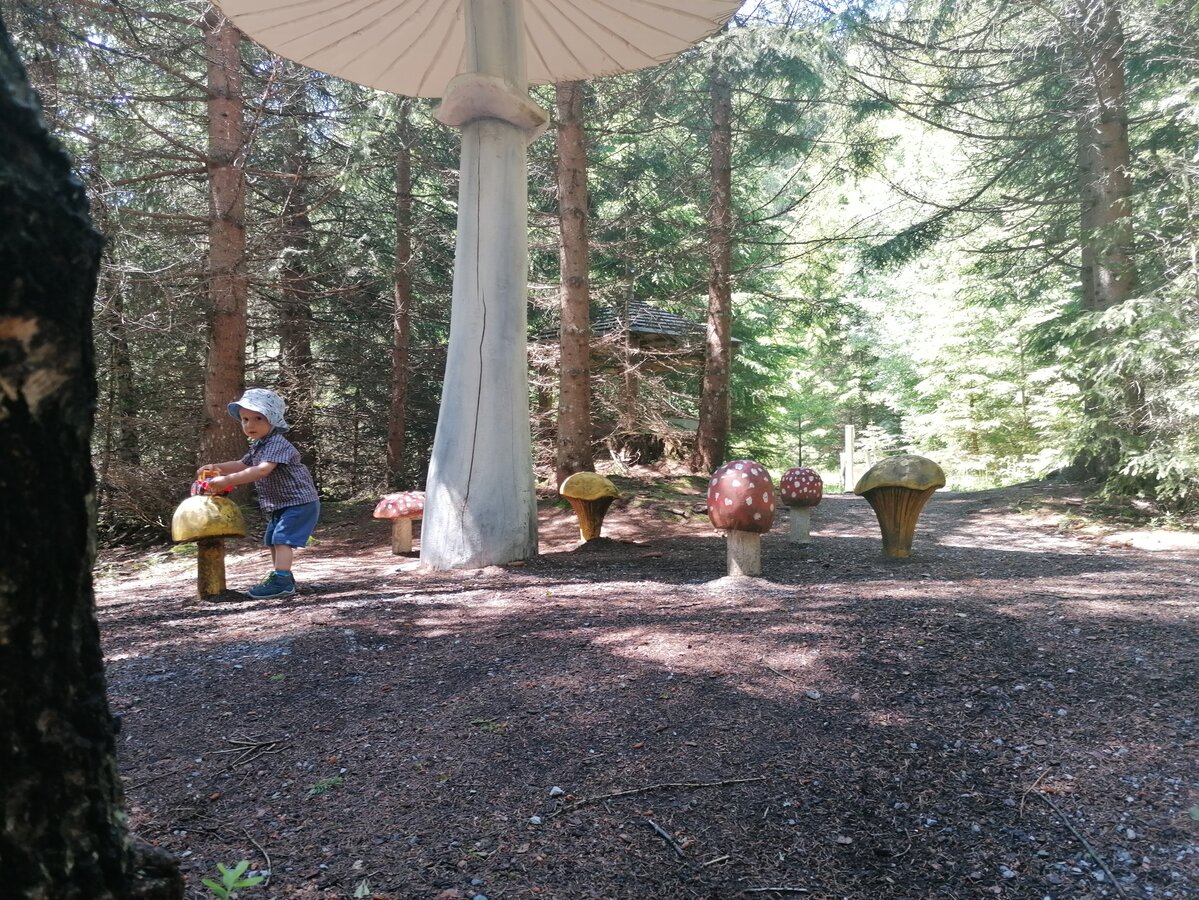 Besonders die überdimensionalen Pilze haben es ihm angetan. Darunter lässt es sich so gut verstecken! "Mamaaa, such mich!", hallt es da dann durch den Wald. Auch Zweifachmama Kathrin liebt das schattige Areal oberhalb von Ladis. Da es hier nicht allzu weitläufig und gut überschaubar ist, kann der Kleine ohne Bedenken selbst auf Entdeckungstour gehen. Kathrin kann sich dann auch mal entspannt zurücklehnen und die Zeit mit ihrer kleinen Tochter Mathea genießen, die ruhig im Tragetuch schläft.