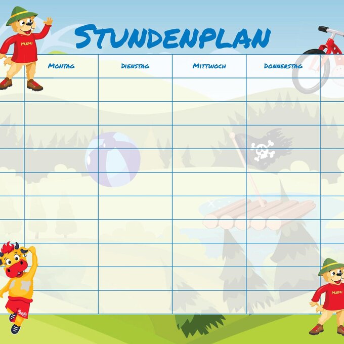 Den bunten Stundenplan kannst du ganz einfach ausdrucken und gleich ausfüllen. Mama und Papa helfen dir bestimmt dabei. Mit Murmli und Berta macht der Schulstart doch gleich doppelt so viel Spaß! Welches Maskottchen ist dein Liebling?