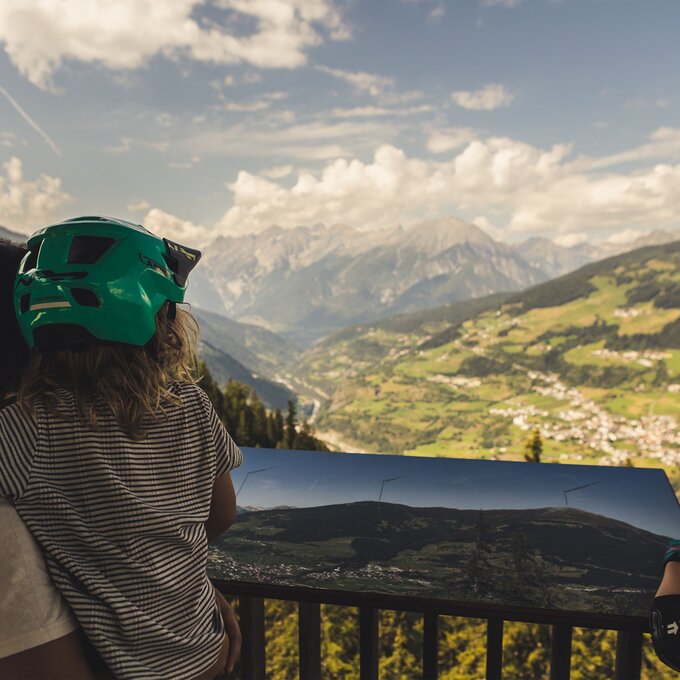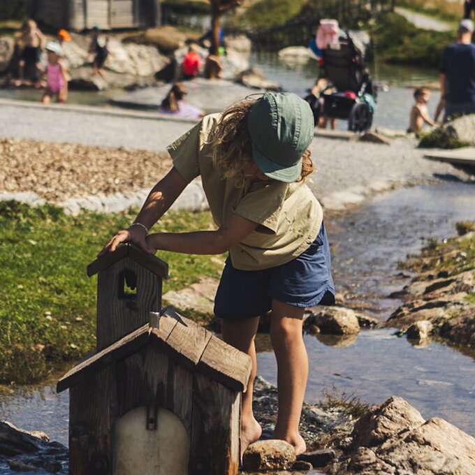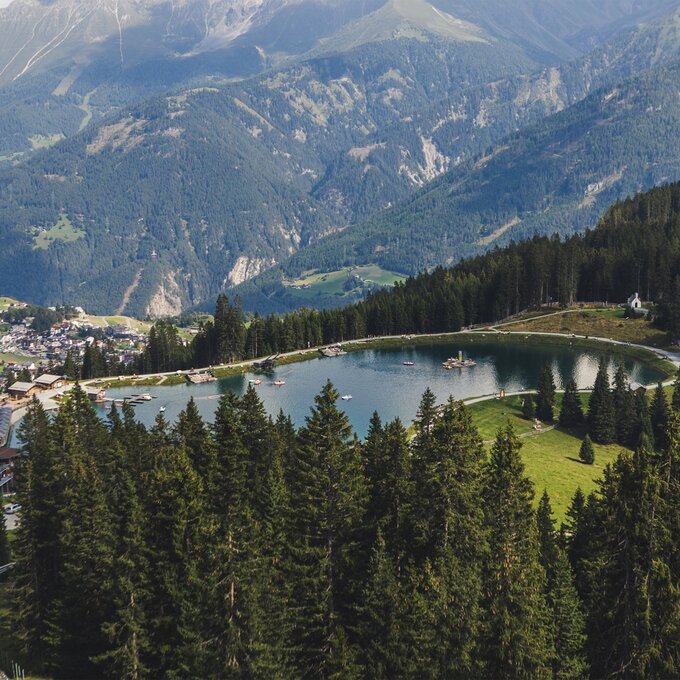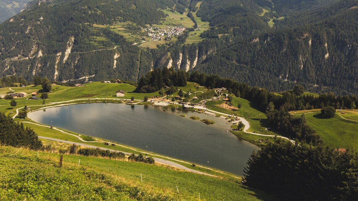 Weiter geht es recht flott auf der Route 7105 bergab, ehe sich die Strecke nach ein paar Hundert Metern teilt: Franzi fährt mit Leo weiter bergab in Richtung Ladis, um dann mit der Gondel hoch nach Fiss zu pendeln. Marius und Casper hingegen wollen sich noch etwas auspowern und nehmen die Route 766 Richtung Fiss über den Wolfsee. Das sind nochmal ca. 200 Höhenmeter durch den Bergwald mit weiteren wunderbaren Blicken in die Berge, also wirklich lohnenswert. Das eigentliche Highlight für die Kids kommt aber dann am Wolfsee, der tatsächlich ein Speicherteich ist. Hier kann man die Füße ins Wasser baumeln lassen oder einfach auf den unzähligen Liegen und Bänken die Szenerie auf sich wirken lassen. Auf der rechten Uferseite gibt es ein umfangreichen Spielplatz mit Wasserlauf für Kinder. Beim Stauen des Wassers und Öffnen der Schleusen geht der Tag vergnügt zu Ende. Hunde sind leider nur auf der anderen Seite erlaubt, am normalen Rad-/Wanderweg.