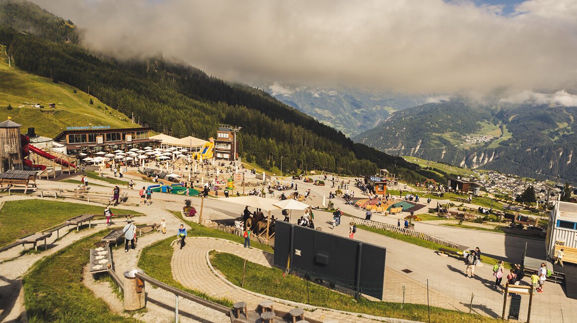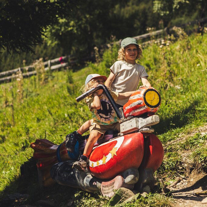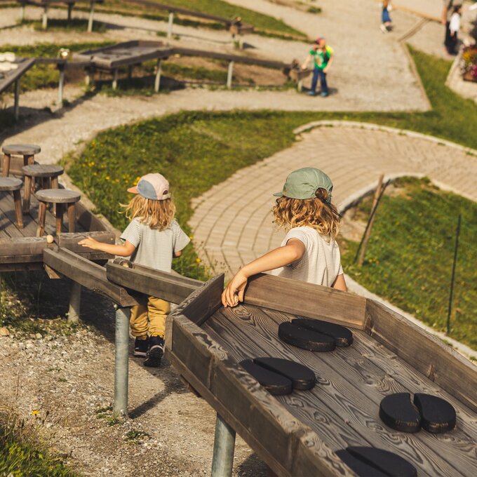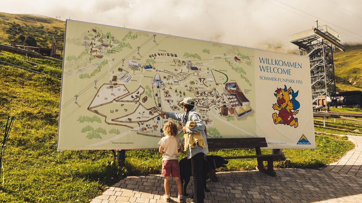 Da es bereits 15 Uhr ist und die Kinder zu müde für eine richtige Wanderung sind, beschließen wir, mit der Möseralmbahn bequem hinaufzufahren, die uns direkt zum Sommer-Funpark-Fiss bringt. Wir staunen nicht schlecht, was uns hier oben alles erwartet: verschiedene Kugelbahnen, ein Streichelzoo, Wasser-/Sandspielplätze und wilde Attraktionen wie ein Sprungturm mit Riesenluftkissen, der Flugdrache Fisser Flieger oder der Skyswing. Die letzte Gondel ins Tal fährt um 17 Uhr, doch wir lassen es und nicht nehmen, mit der Sommerrodelbahn Fisser Flitzer zurück ins Tal zu flitzen und das war ein riesen Spaß!