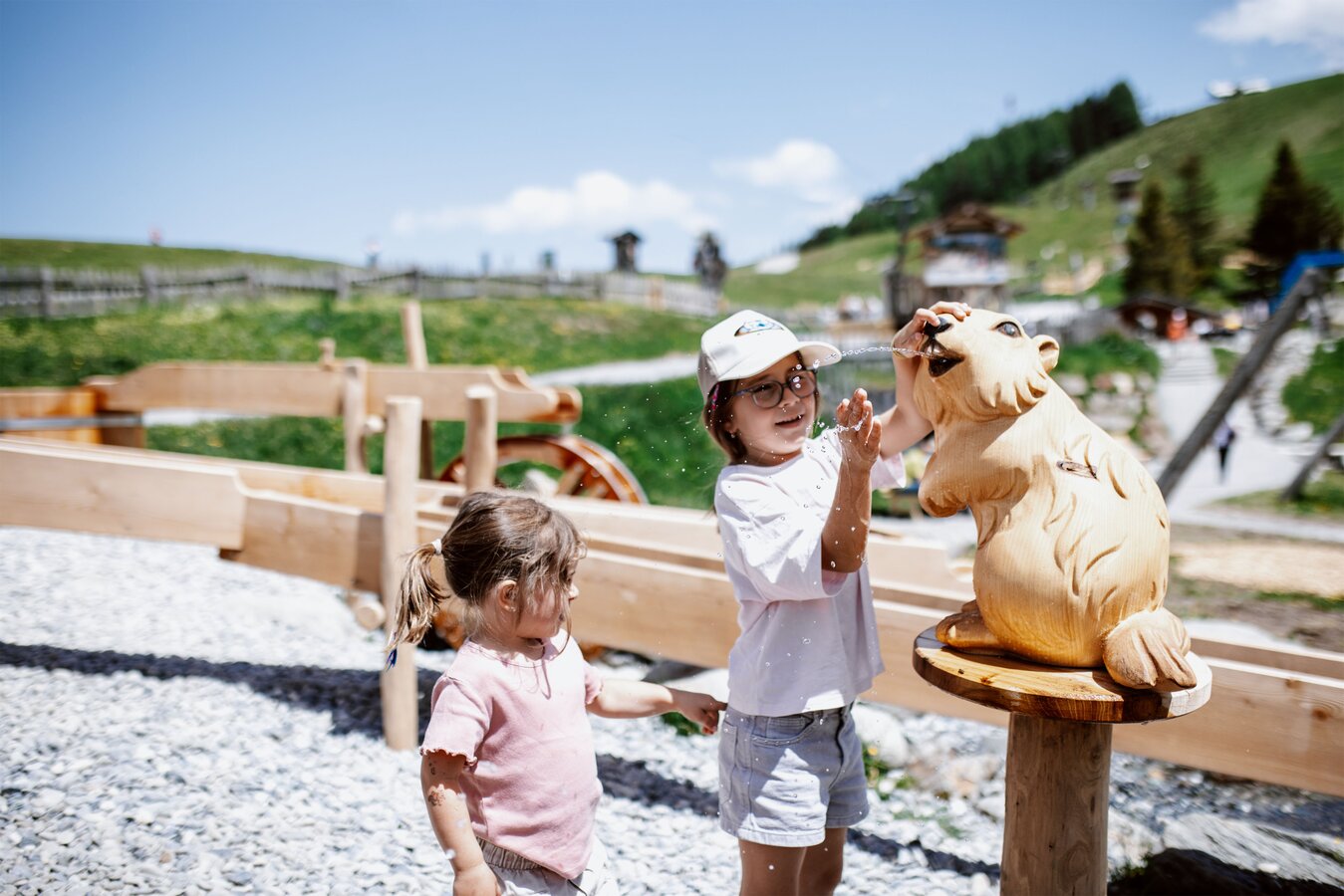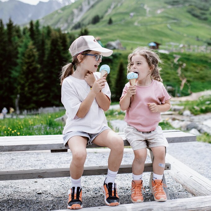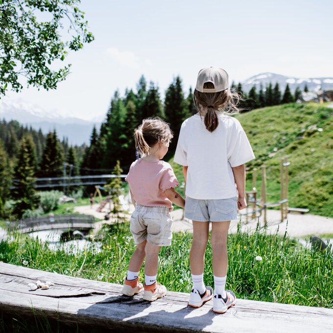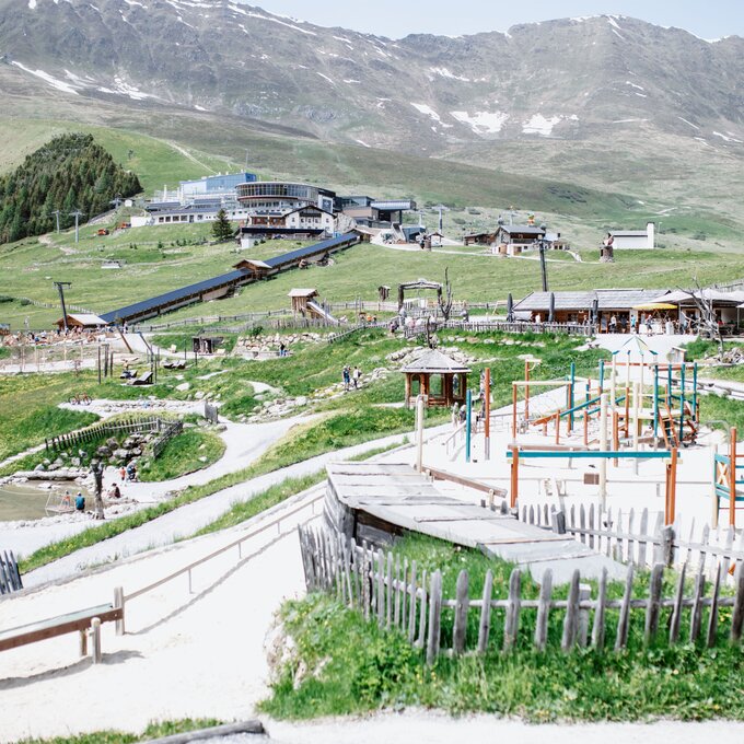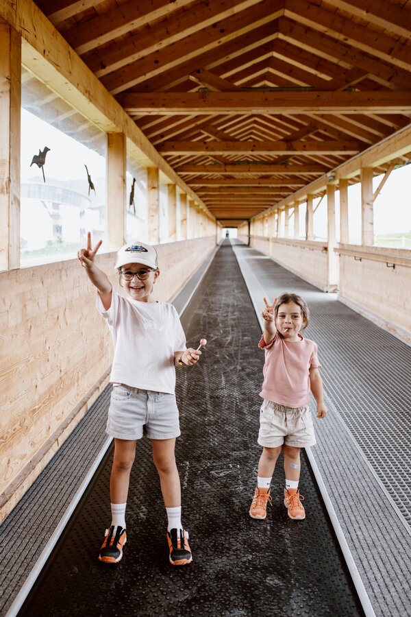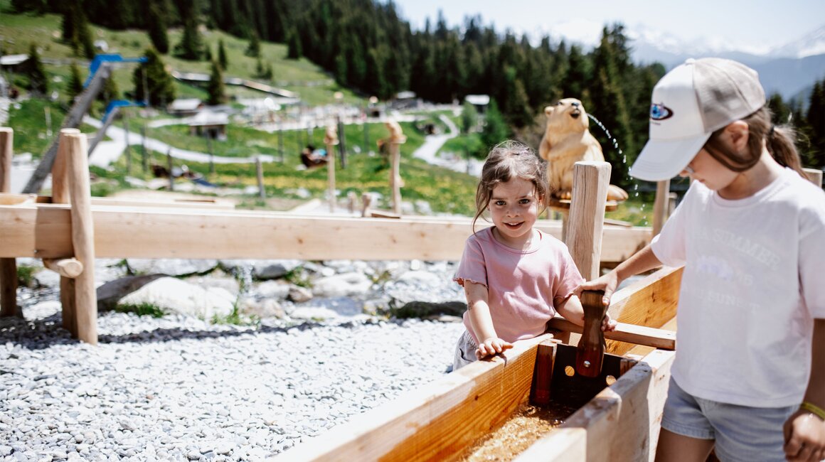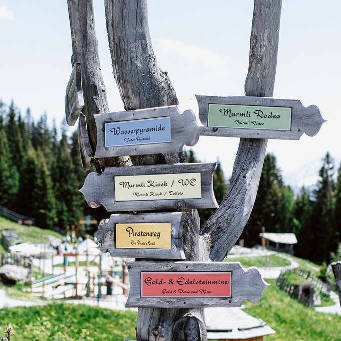 Von der Bergstation aus führt ein kurzer Spazierweg zum Murmliwasser, das auf 1.980 Metern Seehöhe liegt. Für den Rückweg steht vom Spielpark aus ein Förderband zur Verfügung. Besonders mit müden Kindern und Kinderwagen ist dies äußerst praktisch. Die namensgebenden Murmli – also die Murmeltiere – sind hier schon überall zu finden: Als überlebensgroße, aufblasbare Figuren, aus Holz geschnitzt und sogar als lebende Tiere im Murmeltiergehege, wie Ella und Flora später entdecken werden.