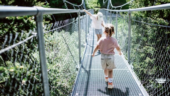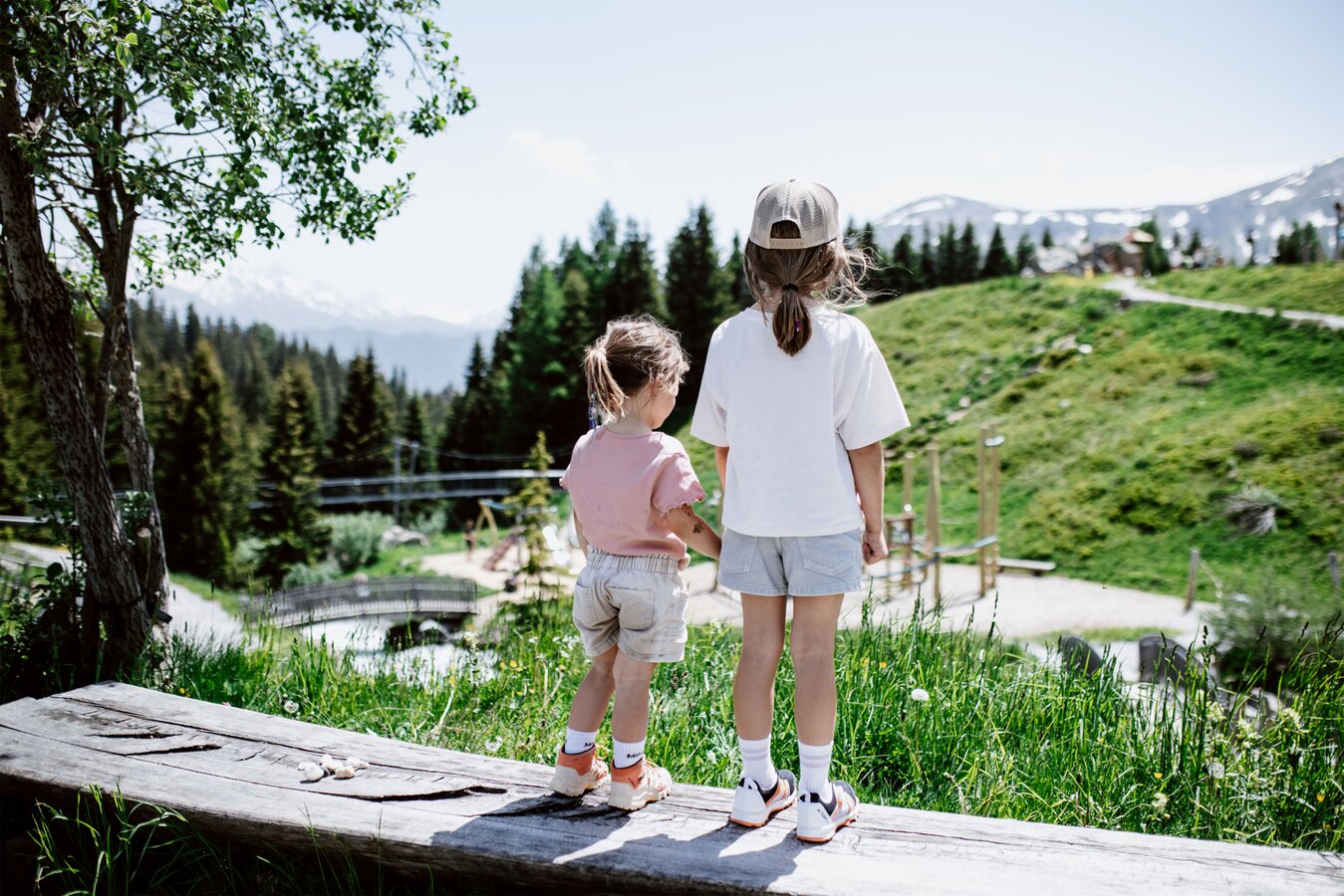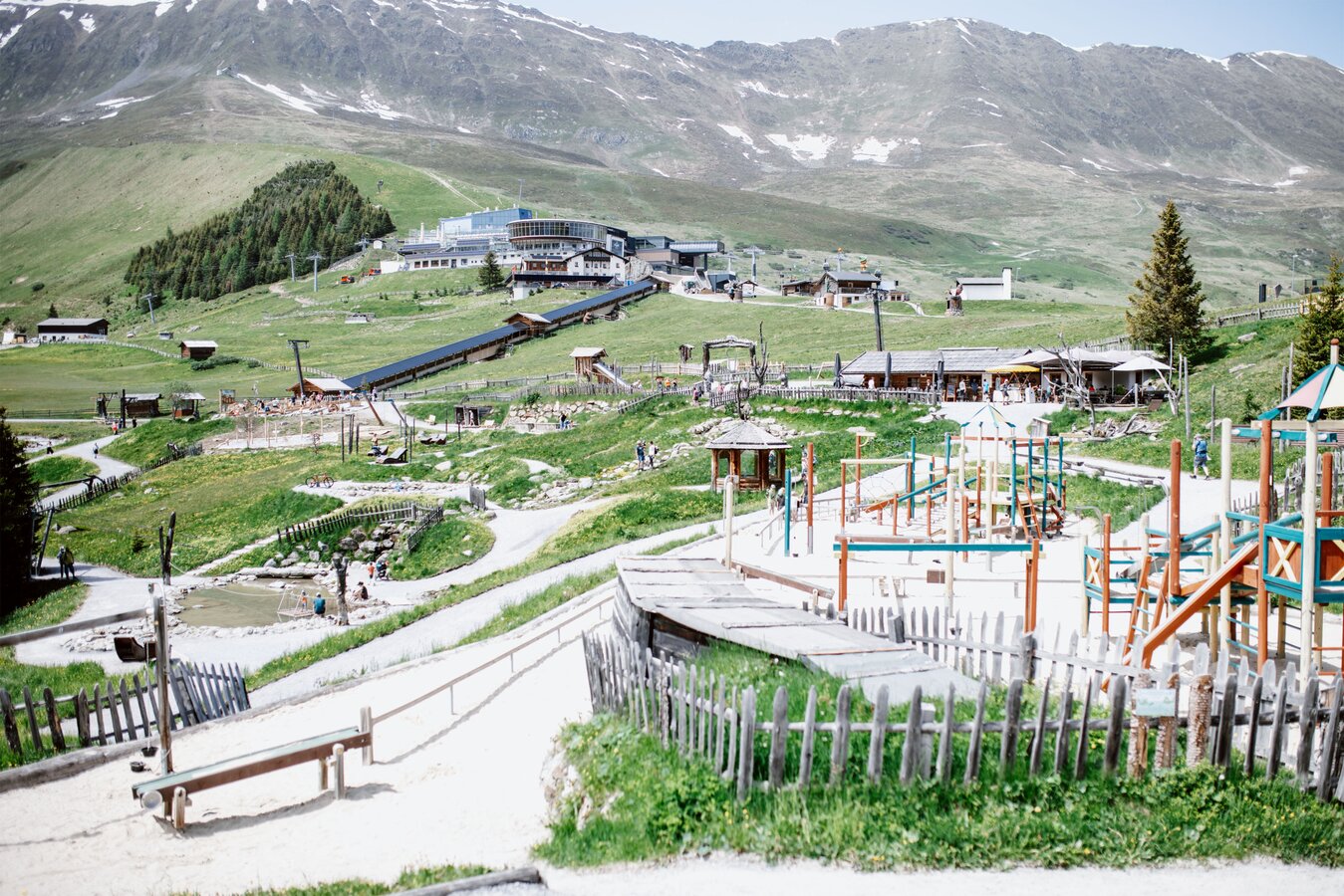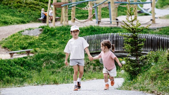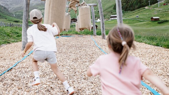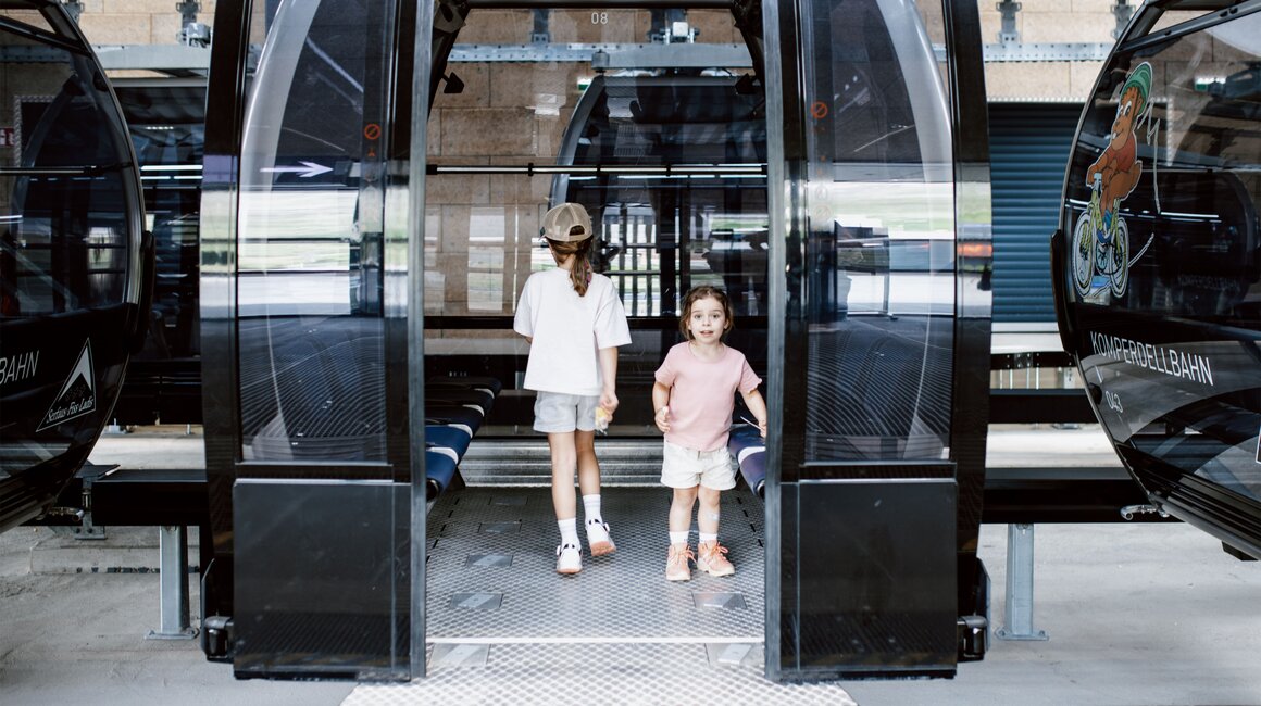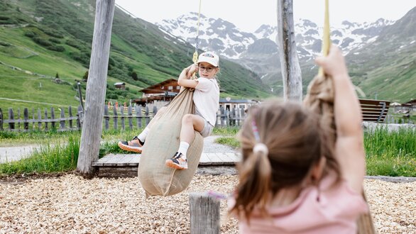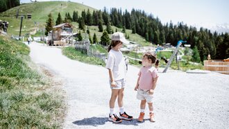 Von der Bergstation aus führt ein kurzer Spazierweg zum Murmliwasser, das auf 1.980 Metern Seehöhe liegt. Für den Rückweg steht vom Spielpark aus ein Förderband zur Verfügung. Besonders mit müden Kindern und Kinderwagen ist dies äußerst praktisch. Die namensgebenden Murmli – also die Murmeltiere – sind hier schon überall zu finden: Als überlebensgroße, aufblasbare Figuren, aus Holz geschnitzt und sogar als lebende Tiere im Murmeltiergehege, wie Ella und Flora später entdecken werden.
