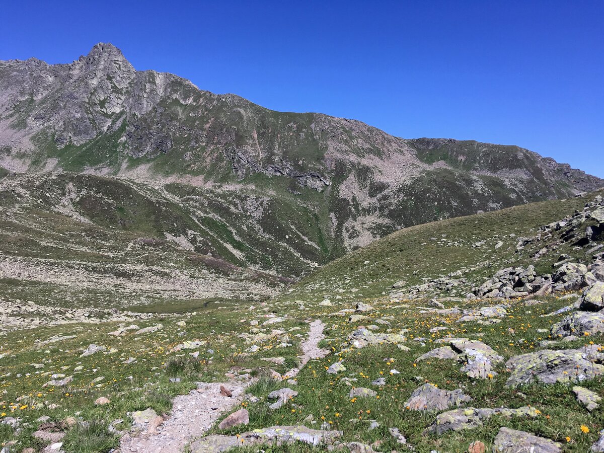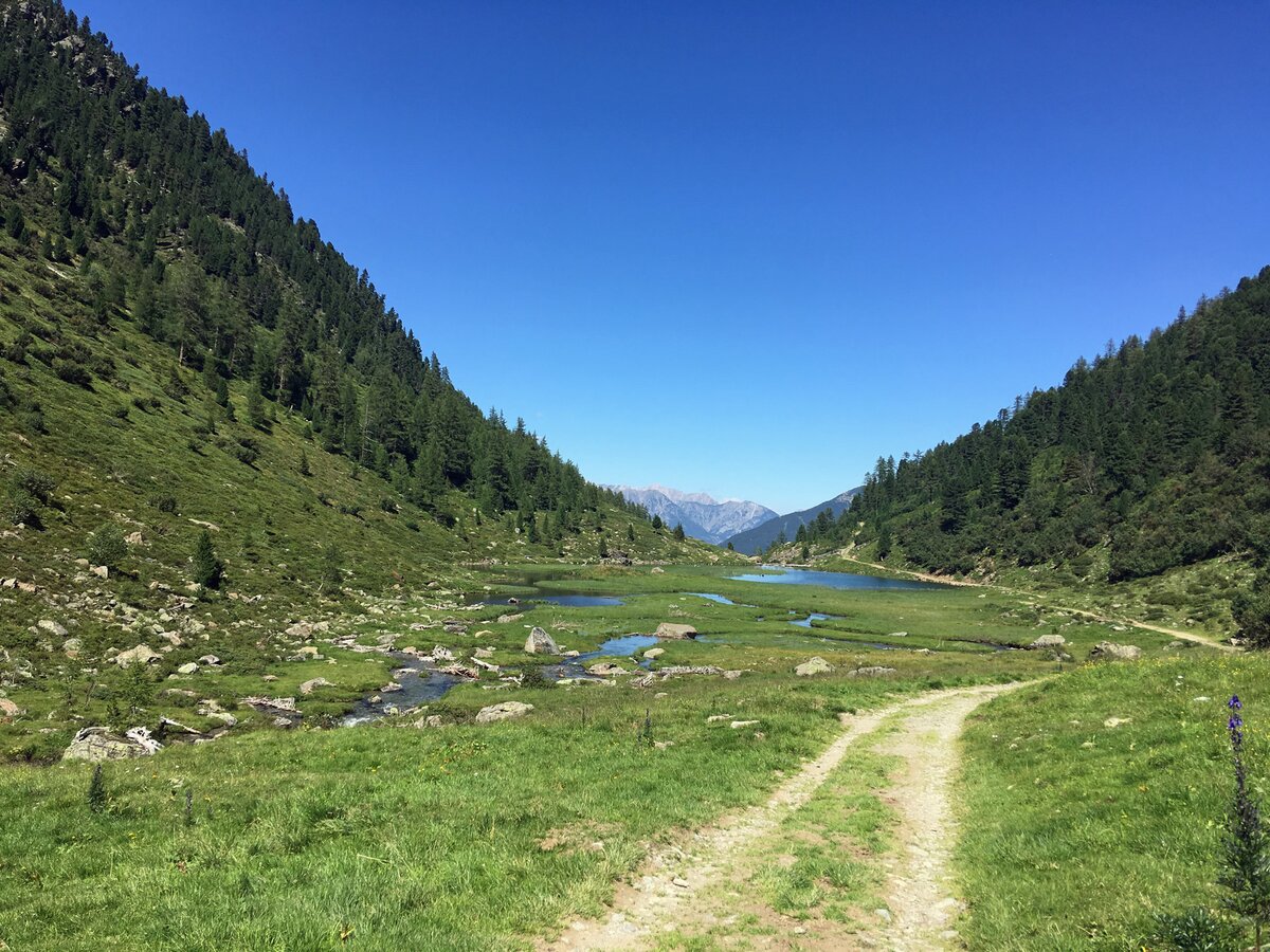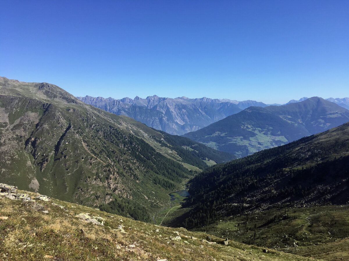 Als Wanderung wählten wir den Spinnseensteig, welcher mit einer Gehzeit von fünf Stunden, bis zur Schöngampalm, angeschrieben war (Weg 16). Da der Weg zwischenzeitlich etwas steinig verläuft, ist Trittsicherheit und gutes Schuhwerk erforderlich. Zudem sollte man berggeübt sein und über ausreichende Kondition verfügen. Motiviert und voller Vorfreude starteten wir in westliche Richtung und gingen zu Beginn ein kleines Stück den „Goldenen Mann Weg“ entlang. Nach wenigen Metern ging es für uns auf dem flachen Hangweg unterhalb des Zwölferkopfes hinüber zum Zwölferjoch. Hier empfiehlt sich ein Abstecher zur Aussichtsplattform Z1, die beeindruckende Weitblicke über unsere Region und die umliegende Bergwelt bietet.