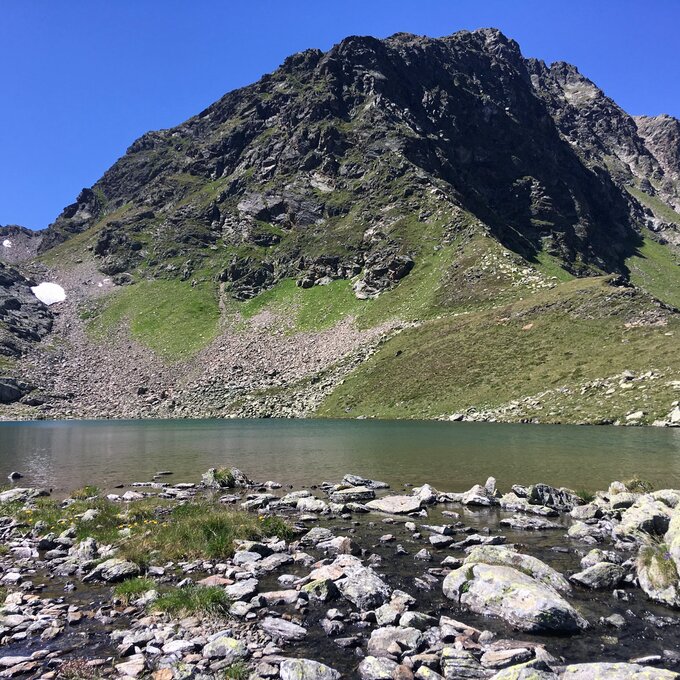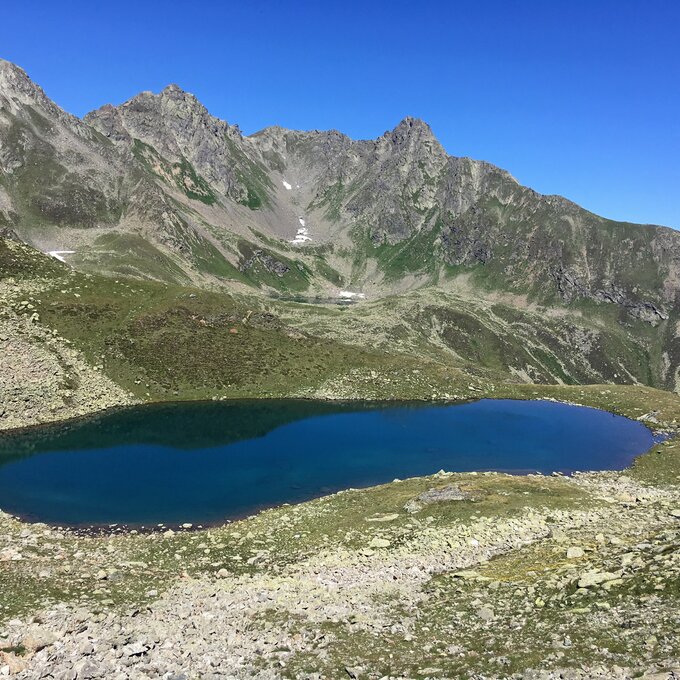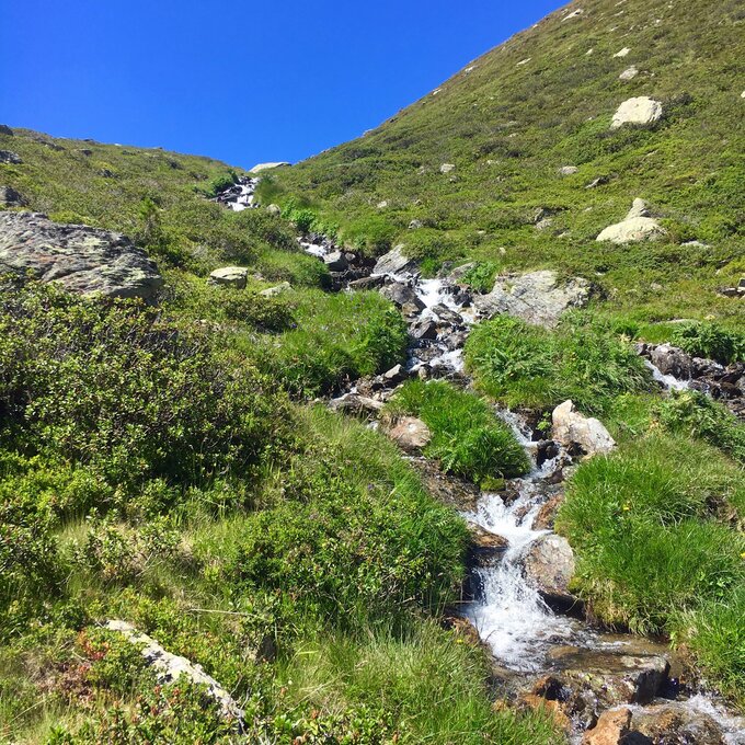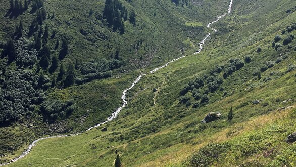 Das Plätschern des Bergbaches, der sich durchs komplette Tal schlängelt, begleitete uns. Nach ca. 1,5 Stunden Fußmarsch erreichten wir den Talgrund, wo wir nach einem leichten Anstieg eine kleine Holzbrücke überquerten. Zum Oberen Spinnsee ging es dann stetig (teilweise steil) ansteigend auf einem Bergrücken dem Bach entlang. Als wir nach rund einer Stunde oben an der Bergkuppe ankamen, stockte uns kurzzeitig der Atem. Denn was wir erblickten, war einfach atemberaubend! Zu unseren Füßen lag der kristallblau glitzernde Obere Spinnsee – der erste der beiden Bergseen.