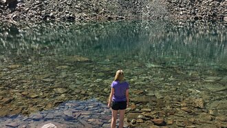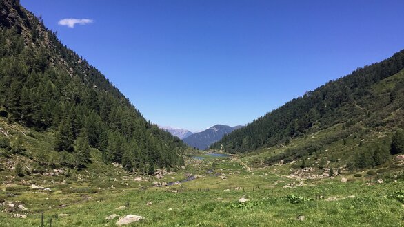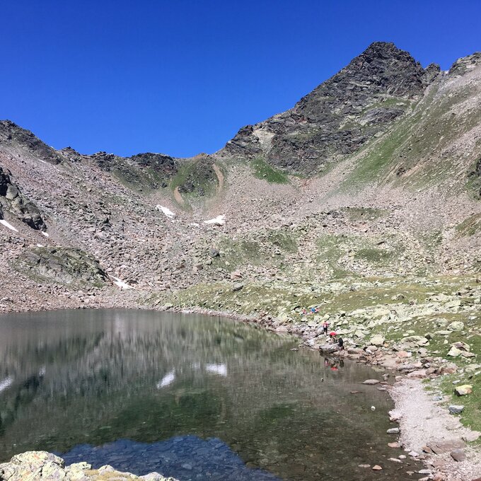 Nach einer dreiviertelstündigen Pause setzten wir unsere Tour fort. Bestens gestärkt machten wir uns auf den Weg zum Unteren Spinnsee - dem zweiten Bergsee. Zunächst ging es über flache Almböden, bis wir nach einem etwas abfallenden Stück nach ca. 20 Minuten Gehzeit den Unteren Spinnsee erreichten. Hier blieben wir kurz für einen Schnappschuss stehen und schon ging es weiter hinunter zum Grund des Urgtales. Vorbei an zahlreichen Moosbeersträuchern (Heidelbeeren), von denen die ein oder andere köstlich schmeckende Beere in unserem Mund landete. Mmh!
