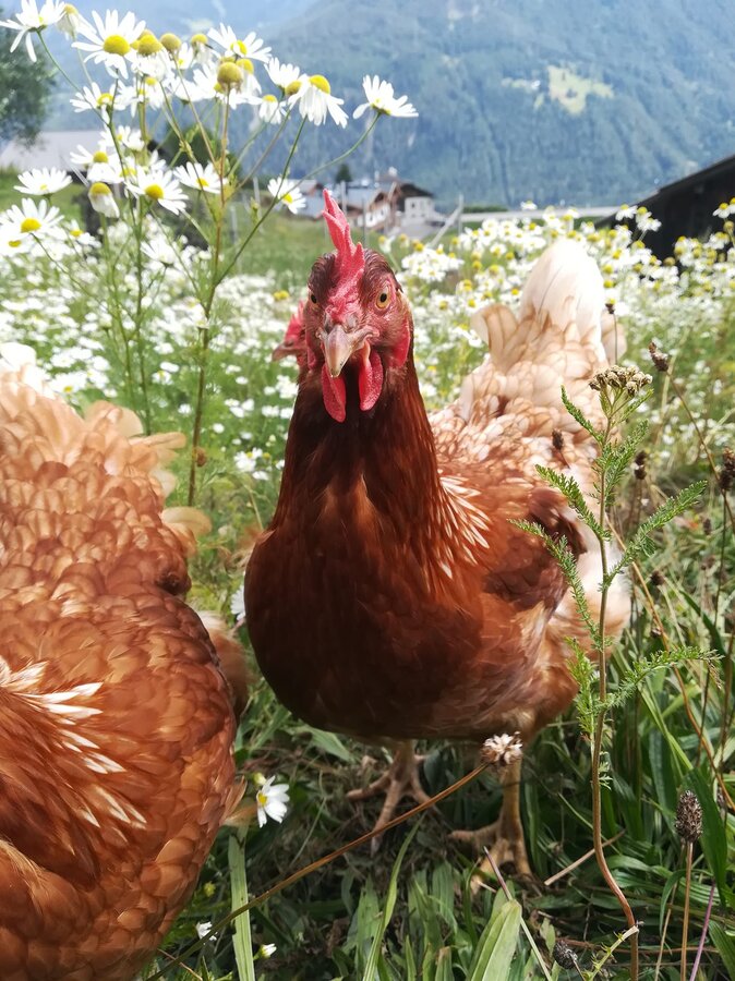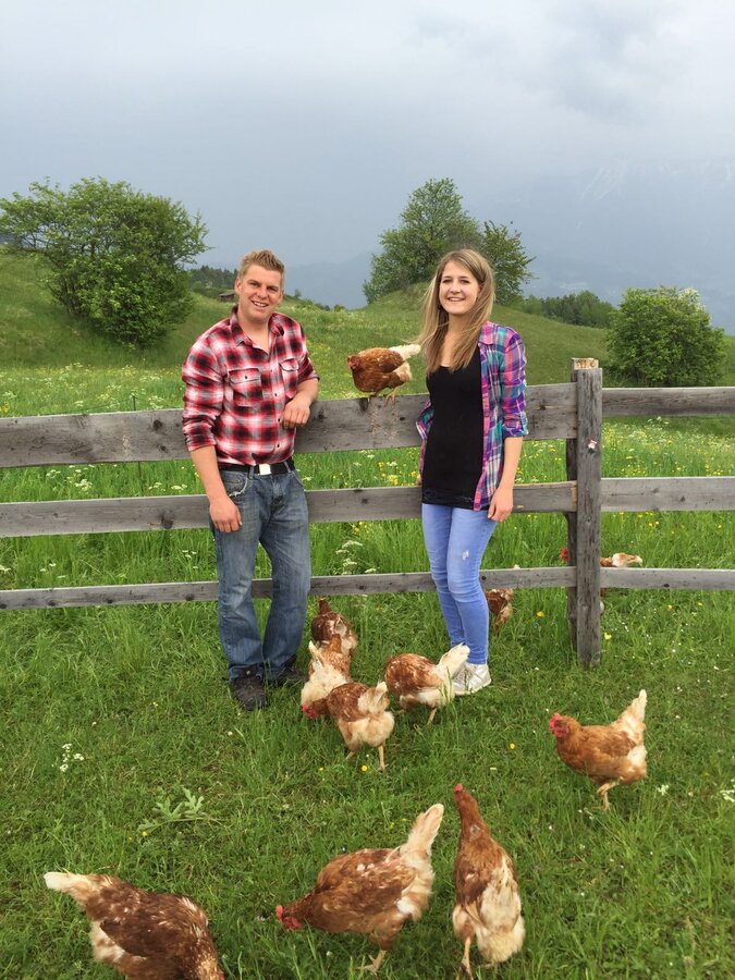 Florian und Gloria wirken auf Anhieb nicht wie typische Bergbauern, eher wie ein hippes, junges Pärchen. Aber was heißt das schon? Florian hat den Abschluss eines landwirtschaftlichen Meisters, die Idee einen Hühnerstall zu bauen, kam nicht von ungefähr. Gloria gefiel die Vision auf Anhieb. So entstand 2016 die Idee zu den „Fisser Goggala“. Nach etlichen Besichtigungen von Hühnerställen in der Region, entschieden sich die beiden für einen großen, geräumigen Stall am nordöstlichen Ortsrand von Fiss mit viel grünem Auslauf rund herum. „Wir sind kein zertifizierter Biobetrieb, aber wir hatten eigentlich von Anfang an die Absicht, unsere Hühner nachhaltig und freilaufend zu behandeln. Das ist uns auch gelungen“, erklärt Florian die Anfänge der Fisser Goggala. Im Stall mit großer Weide gackern mittlerweile rund 800 HÜHNER.