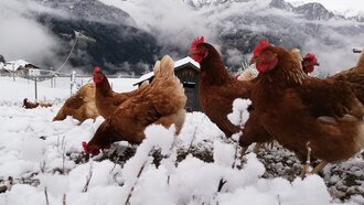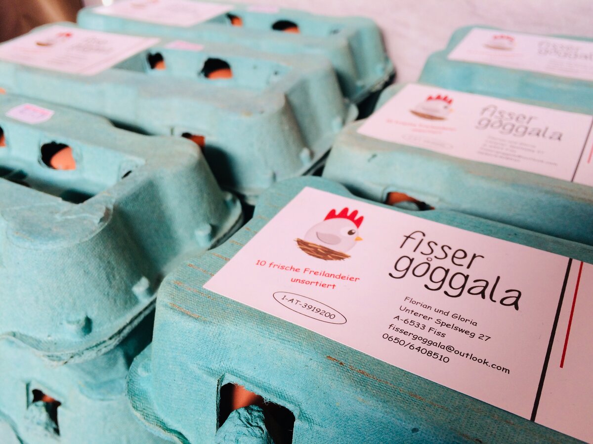 Alle ein bis zwei Tage legen die fleißigen Hennen bei Familie Plangger je ein "Goggala" – die meisten davon werden auf direktem Weg an Hotels, die Seilbahn und einheimische Fans der „Fisser Goggala“ verkauft. Die Bäckerei-Konditorei Althaler verwendet die Eier beispielsweise für ihre Zöpfe oder Kipferl. Aber auch Eierlikör, Dinkel-Bandnudeln und Hartweizen-Spirelli werden in dem kleinen HOFLADEN direkt in der Stallung in Fiss angeboten. Ihr Eierlikör hat es sogar in die "Tiroler Edle" Schokolade geschafft. Schon probiert?