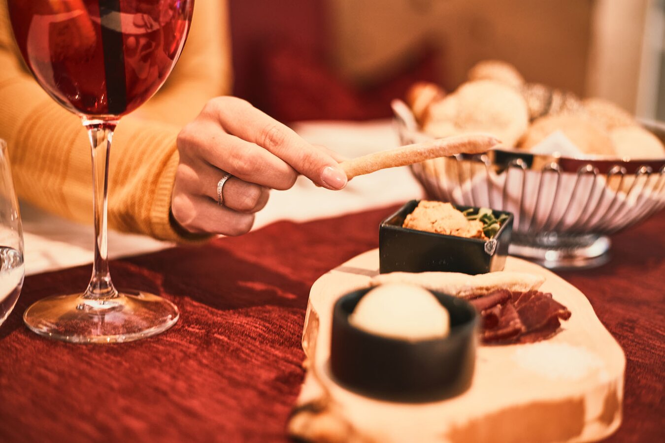 Mit der roten Schönjochbahn gondelten wir Anfang Oktober 1.000 Höhenmeter rauf aufs Fisser Joch. Auf 2.436 Meter wurden wir bereits vom schick gekleideten Gondel-Kellner im Panoramarestaurant BergDiamant empfangen. In der exklusiven Genussgondel-Ecke schlürften wir wenige Momente später genüsslich unseren APERITIF: ein erfrischendes Preiselbeergetränk namens „Grantaspritz“. Dazu wurde uns ein AMUSE GUEULE auf einem Holzbrettchen gereicht: Brot, Aufstriche, Alpenbutter und geräucherter Hirschschinken. Darauf folgte der erste Gang: Vom Forellen-Tatar träume ich immer noch! Nach dem leichten Gaumenschmaus nahmen wir dann voller Erwartungen in unserem rotierenden Mini-Restaurant Platz, das in der Bergstation bereits auf seine Gäste wartete.