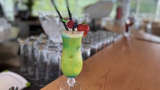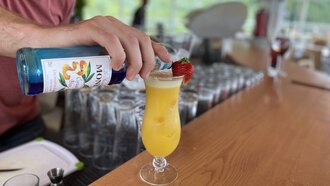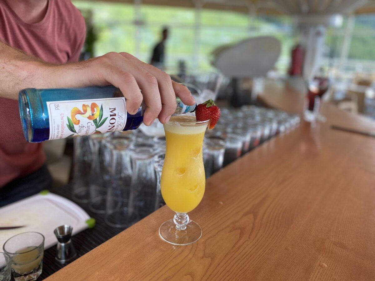 Dann alles zusammen in ein mit Eiswürfeln befülltes Glas geben und den Curacao-Sirup am Glasrand hineinlaufen lassen. Bei der Deko sind der Fantasie natürlich keine Grenzen gesetzt.