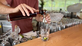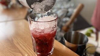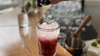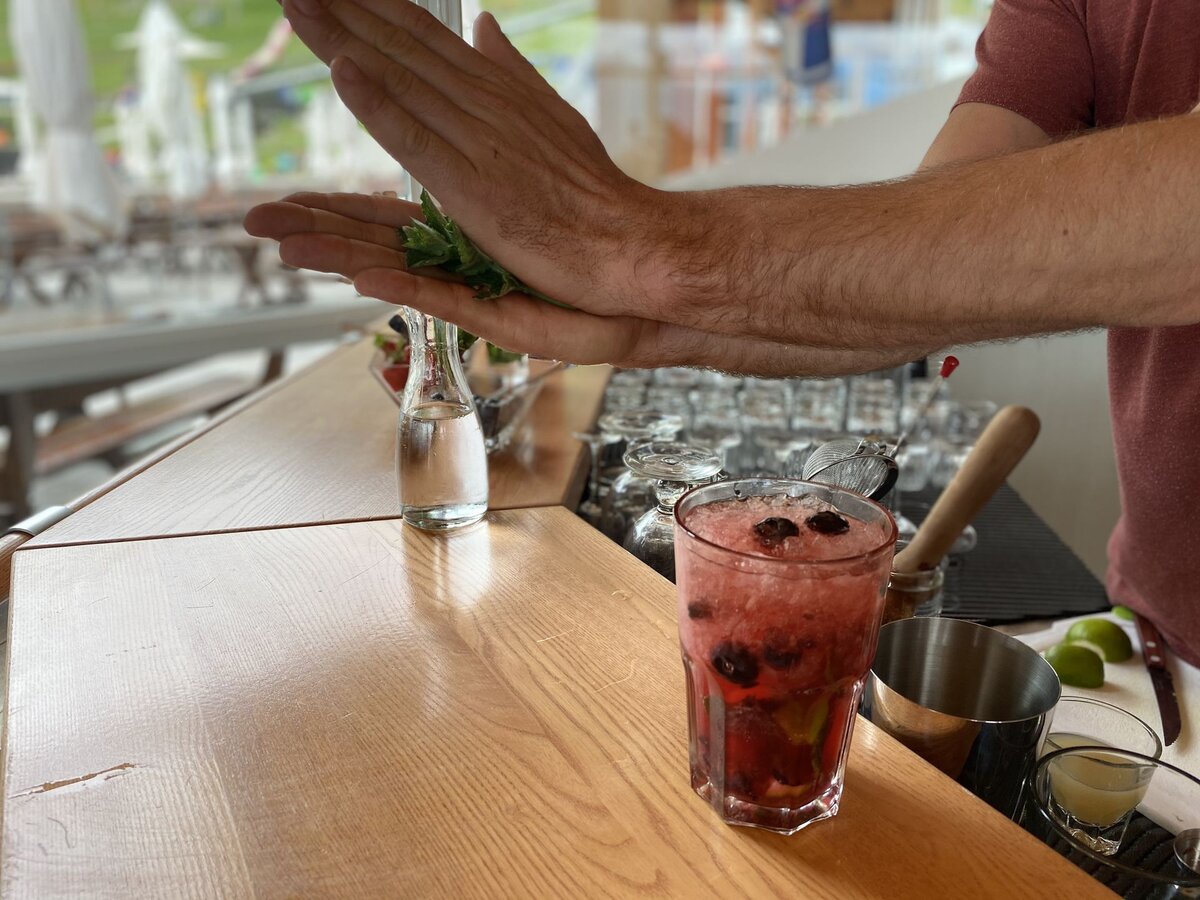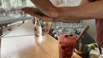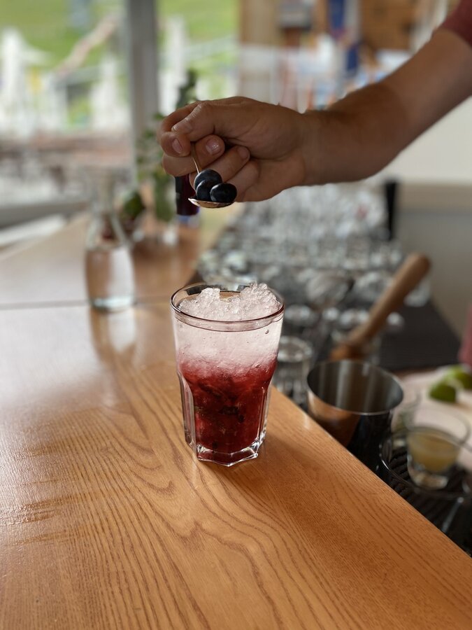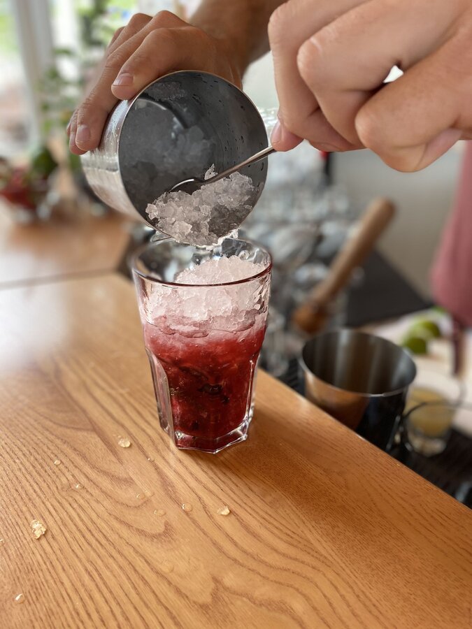 Wenn alles verrührt ist, leicht mit Crushed Ice und mit ca. 10 cl Sodawasser auffüllen. Zum Garnieren ein paar Beeren darauf streuen und nochmals leicht umrühren. Einen Minzzweig in den Händen zerklatschen, dass die Öle austreten und mit diesem garnieren.