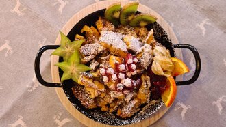 Gleich zu Beginn wickelt er mich mit einem KAISERSCHMARREN um den Finger. Ich denke mir: Mah, ist der gut. Ich bleibe aber wie immer professionell und lasse mich nicht von irgendwelchen locker-luftigen Hütten-Mehlspeisen aus dem Konzept bringen. Ich schnappe mir Papier und Stift und beginne mit der BEFRAGUNG.