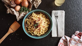 2 EL Butter oder Schmalz, 1 Zwiebel, 5 EL Wurst, Speck oder Käse (was von der Wanderjause übrig ist), 500g Spirelli vom Fisser Goggala, Schnittlauch