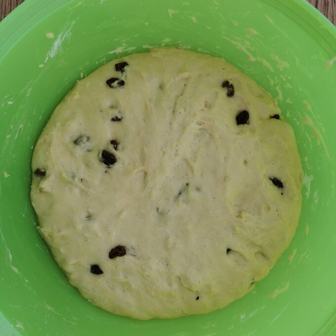 Anschließend die zerlassene Butter, die restliche lauwarme Milch, Eier sowie die weiteren Zutaten zum Mehl geben. Alles zu einem geschmeidigen Teig verarbeiten. Wichtig: Den Teig gut abschlagen.