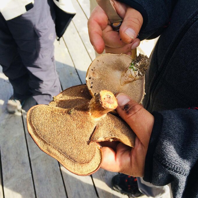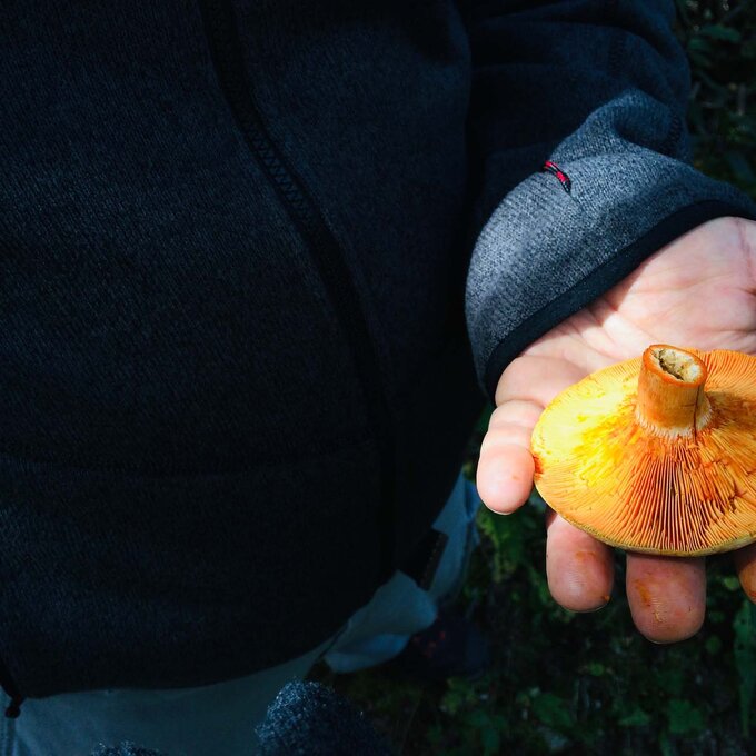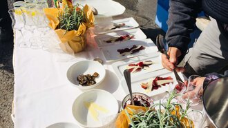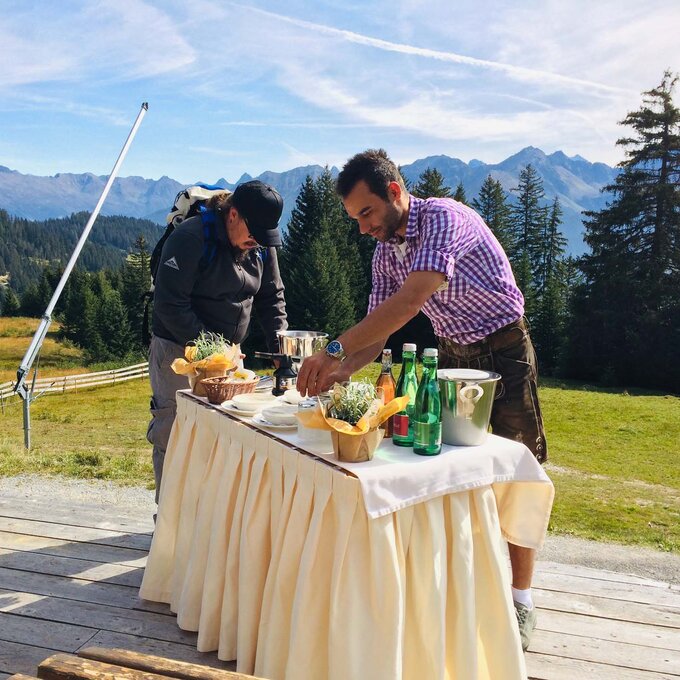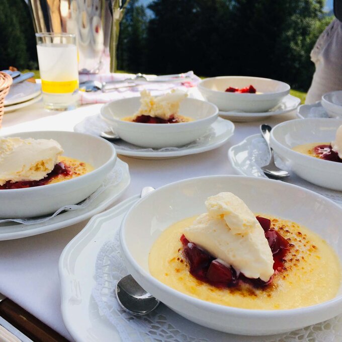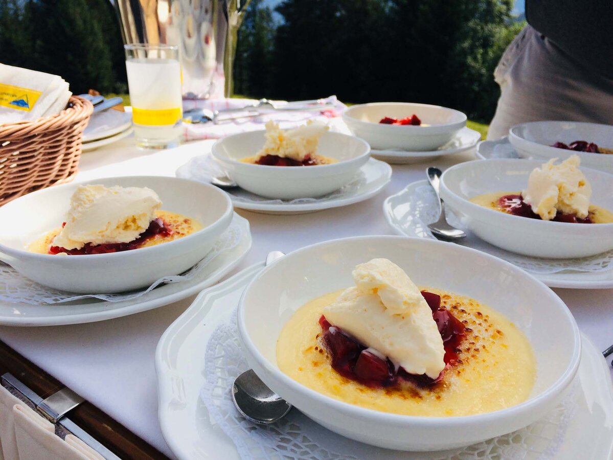 Gut gestärkt wanderten wir von der Komperdellalpe bis zur Wohlfühlstation Mittelabfahrt, an der uns eine gemütliche Wellenbank und -schaukel zur Rast einluden. Ein reichlich gedeckter Tisch inmitten der alpinen Natur zauberte uns ein weiteres Mal ein Lächeln ins Gesicht. Eine Crème Brûlée der besonderen Art wurde von Mike zubereitet. Almkäse führte dazu, dass der französische Klassiker kurzerhand eine Tiroler Note erhielt. Ein Dessert, das diese kulinarische Herbstwanderung zu einem unvergesslichen Geschmackserlebnis machte. Die Crème Brûlée wurde mit süßen Zwetschken und erfrischendem Eis verfeinert. Auch hier war es dem Koch wichtig, dass man die Regionalität schmeckt. Und so war es: Die Zwetschken stammen aus Stanz, das Eis aus eigener Produktion. Als Eis-Grundlage dienten ausschließlich heimische Produkte. Mmmhh ...