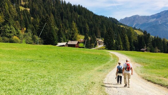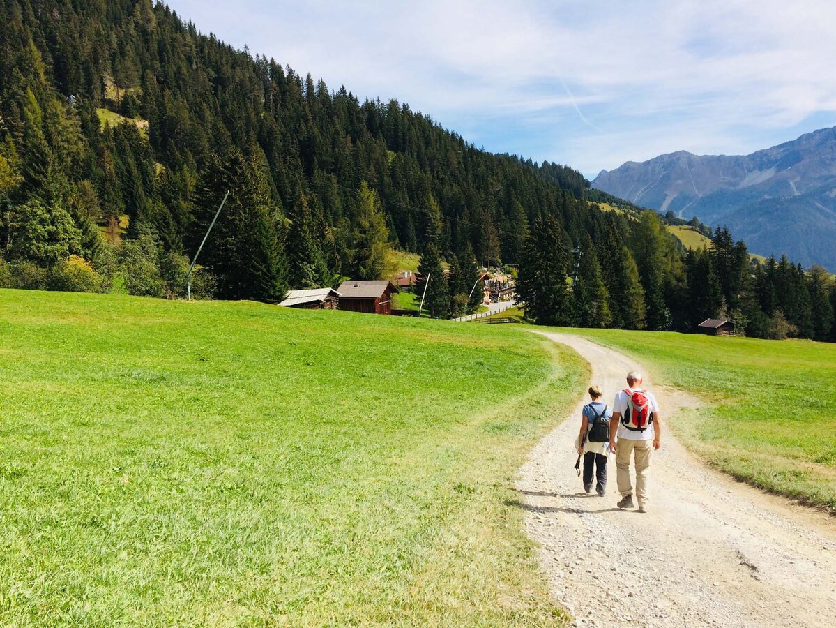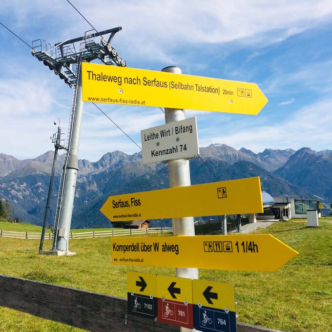 Um zurück nach Serfaus zu gelangen, hat der Wanderer zwei Möglichkeiten. Über den Weg Nr. 9 bzw. 4 (breiter Fahrweg = kinderwagentauglich) ist Serfaus nach etwa zwei Kilometern erreicht. Zweite Möglichkeit: Oder rechts neben der Königsleithebahn (direkt gegenüber vom Leithe Wirt) auf den Thaleweg nach Serfaus schreiten. In etwa 20 Minuten erreicht man die, am westlichen Dorfende liegenden, Talstationen. Der Weg verläuft teils serpentinenartig hinunter nach Serfaus (nicht kinderwagentauglich).